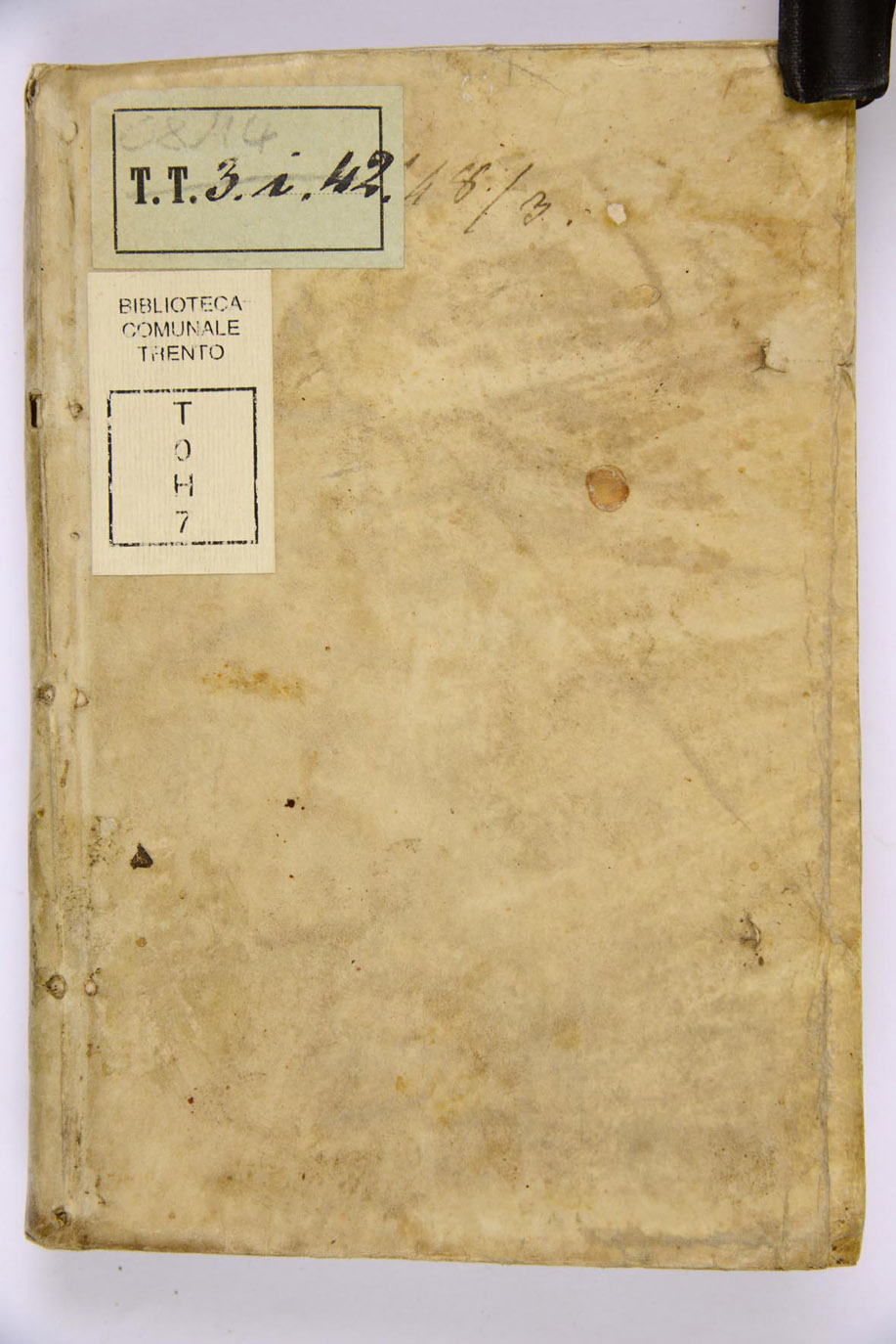 Legatura in pergamena rigida, mm. 160x110x20, c. di guardia ant. e post., ex libris della Biblioteca al verso del piatto ant., nota manoscritta di Giovanni a Prato al verso della c. di guardia ant. relativa al contenuto del testo, 4 note (di possesso?) parzialmente cassate in caratteri ebraici al frontespizio, nota di censura in calce al frontespizio: Frater Paulus Vicecomes Alexandrinus recognovit et a mendis expurgavit ex conventu s. Augustini Taurinensi, correzioni manoscritte alle cc. 3(4)v, 12(6)v, 12(8)v, 13(1)v, cassature a penna alle cc. 7(3)r, 12(1), 12(7)r-13(2)r, 13(3)v, 22(5)r. Esemplare mutilo dell'ultimo fascicolo, timbro della Biblioteca al frontespizio (inchiostro blu, tipo A), antiche segnature di collocazione: T3648/3, T 3 i 42, G 2 h 273.
