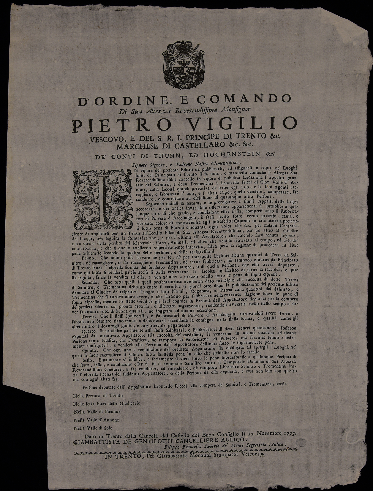 Proclama sull'appalto del salnitro e della trementina emanato il 17 gennaio 1758 da Francesco Felice Alberti d'Enno, principe-vescovo di Trento, stemma di Francesco Felice Alberti d'Enno, sottoscritto da Giambattista Antonio Alberti (cancelliere) e da Filippo Francesco Saverio Manci (segretario).