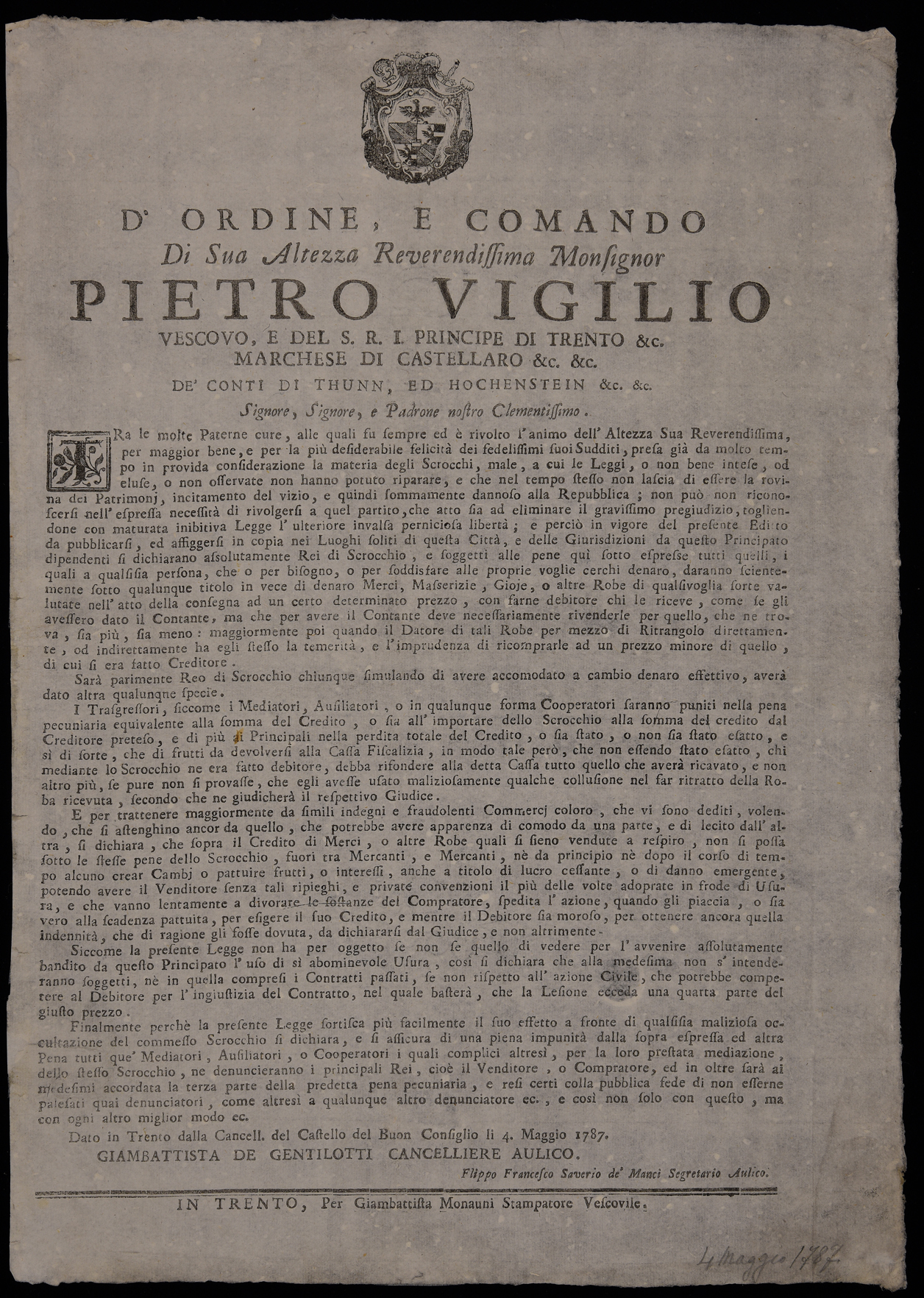 Proclama sul pagamento dei debiti emanato il 4 maggio 1787 da Pietro Vigilio Thun, principe-vescovo di Trento, stemma di Pietro Vigilio Thun.
