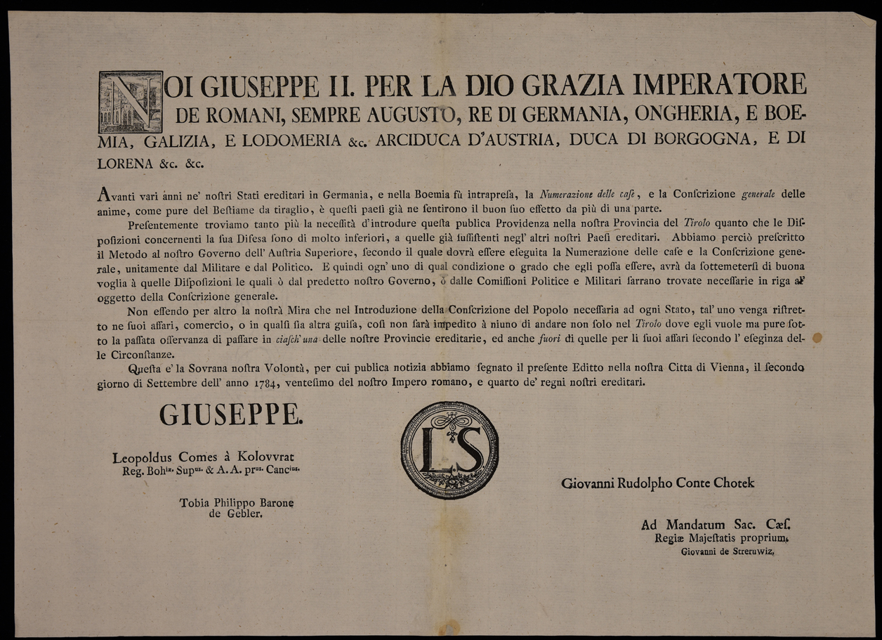 | Noi Giuseppe II. per la Dio grazia imperatore de romani, sempre Augusto, re di Germania, ... |