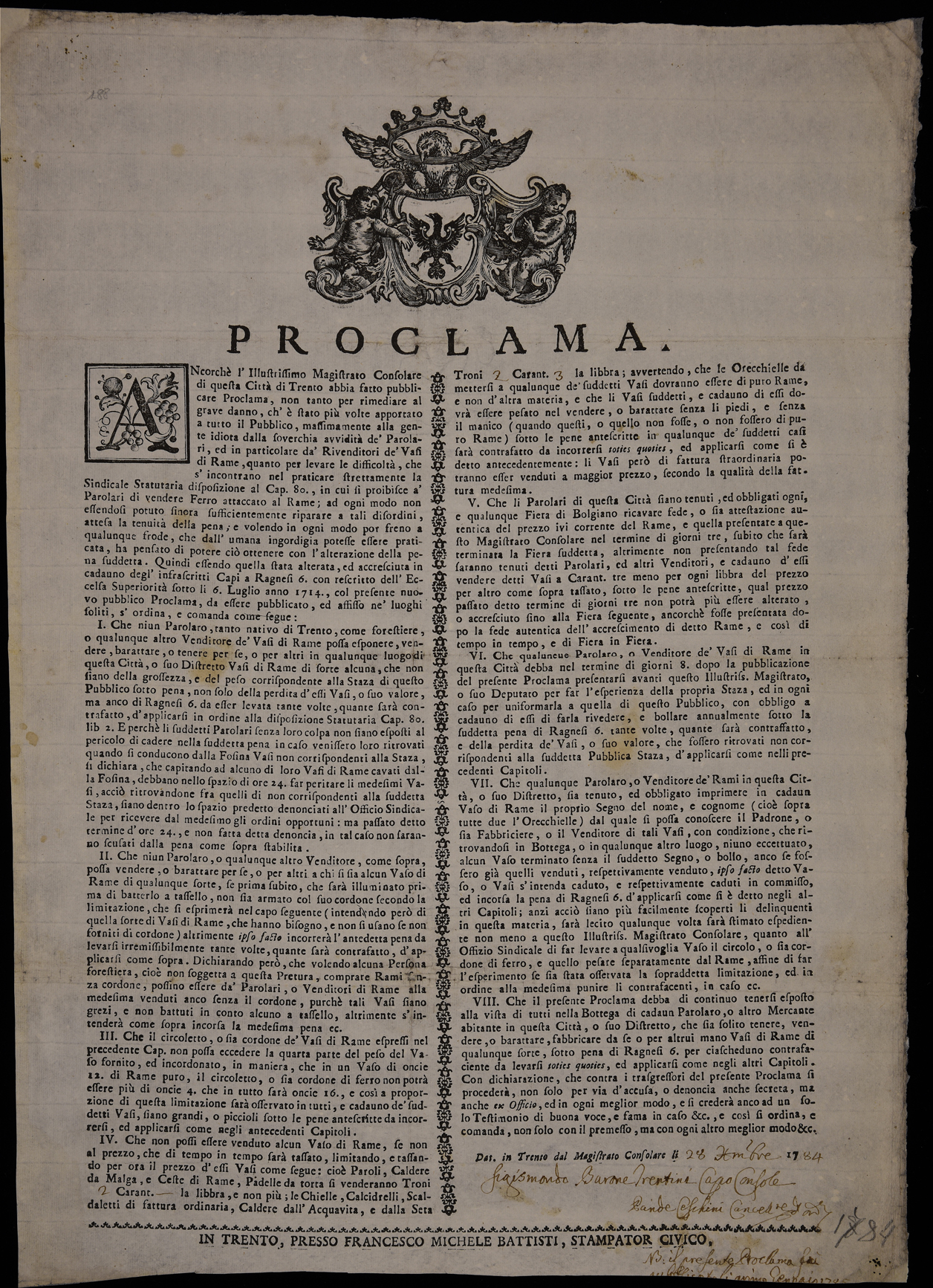 1 manifesto. Proclama sul commercio del rame emanato il 28 dicembre 1784 dal Magistrato consolare di Trento, data di emanazione da una nota manoscritta sull'esemplare della Biblioteca comunale di Trento, stemma del Magistrato consolare di Trento, stampa in realtà da attribuire a Simone Girolamo Battisti in quanto posteriore alla morte di Francesco Michele avvenuta nel 1778