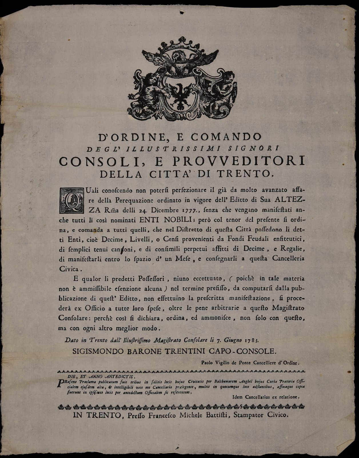 Proclama sugli enti nobili emanato il 7 giugno 1783 dal Magistrato consolare di Trento, stemma del Magistrato consolare di Trento, stampa in realtà da attribuire a Simone Girolamo Battisti in quanto posteriore alla morte di Francesco Michele avvenuta nel 1778.