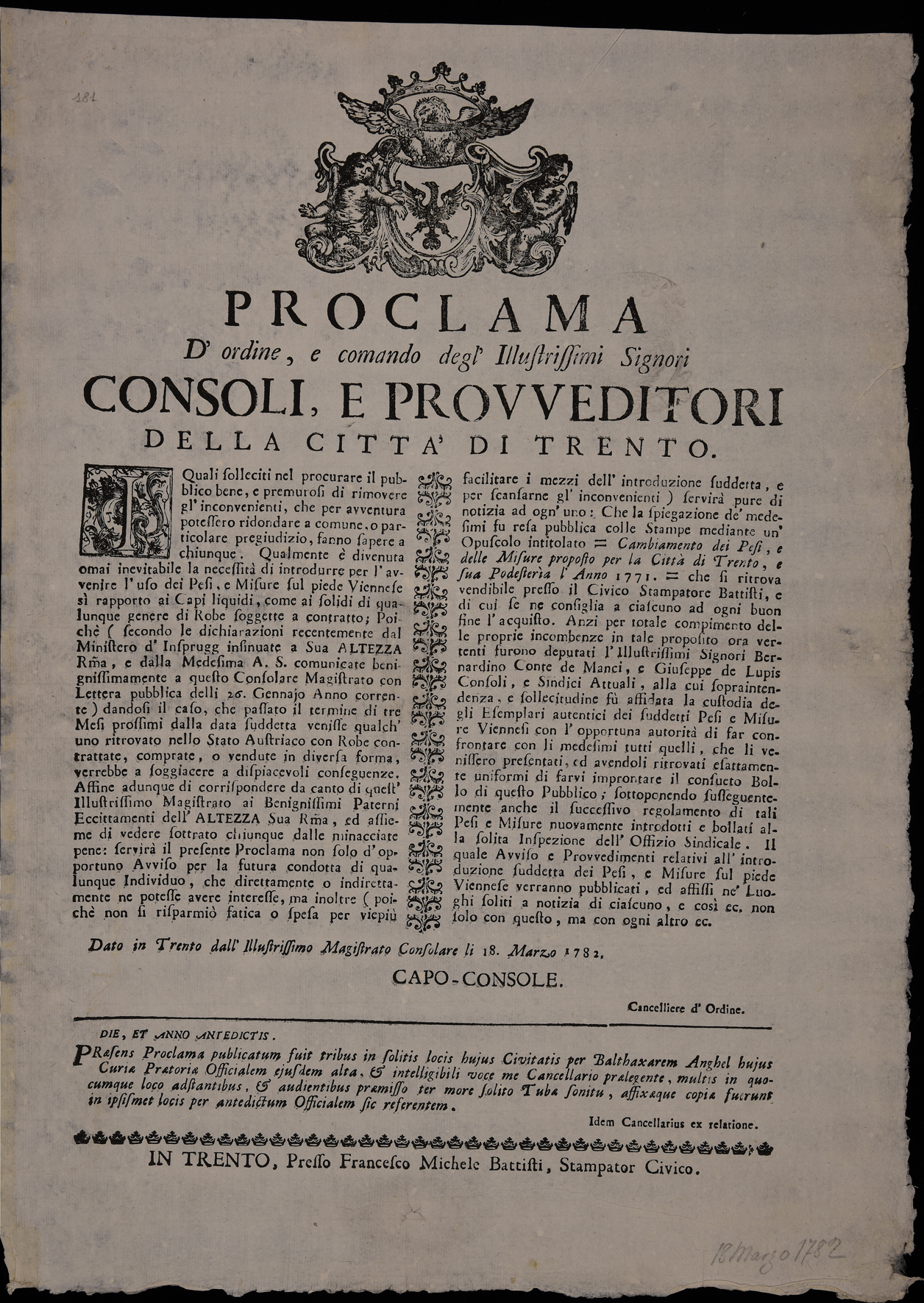 Proclama sul cambiamento di pesi e misure emanato il 18 marzo 1782 dal Magistrato consolare di Trento, stemma del Magistrato consolare di Trento, stampa in realtà da attribuire a Simone Girolamo Battisti in quanto posteriore alla morte di Francesco Michele avvenuta nel 1778.