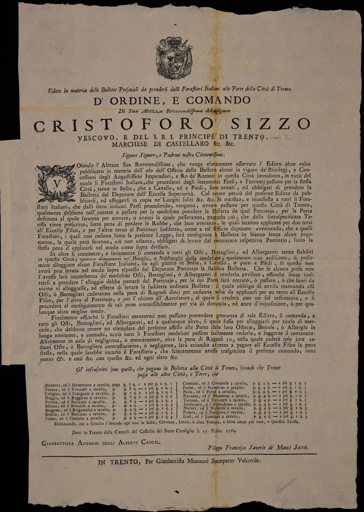 | Editto in materia delle bollette personali da prendersi dalli forastieri italiani alle porte della città di Trento ... |