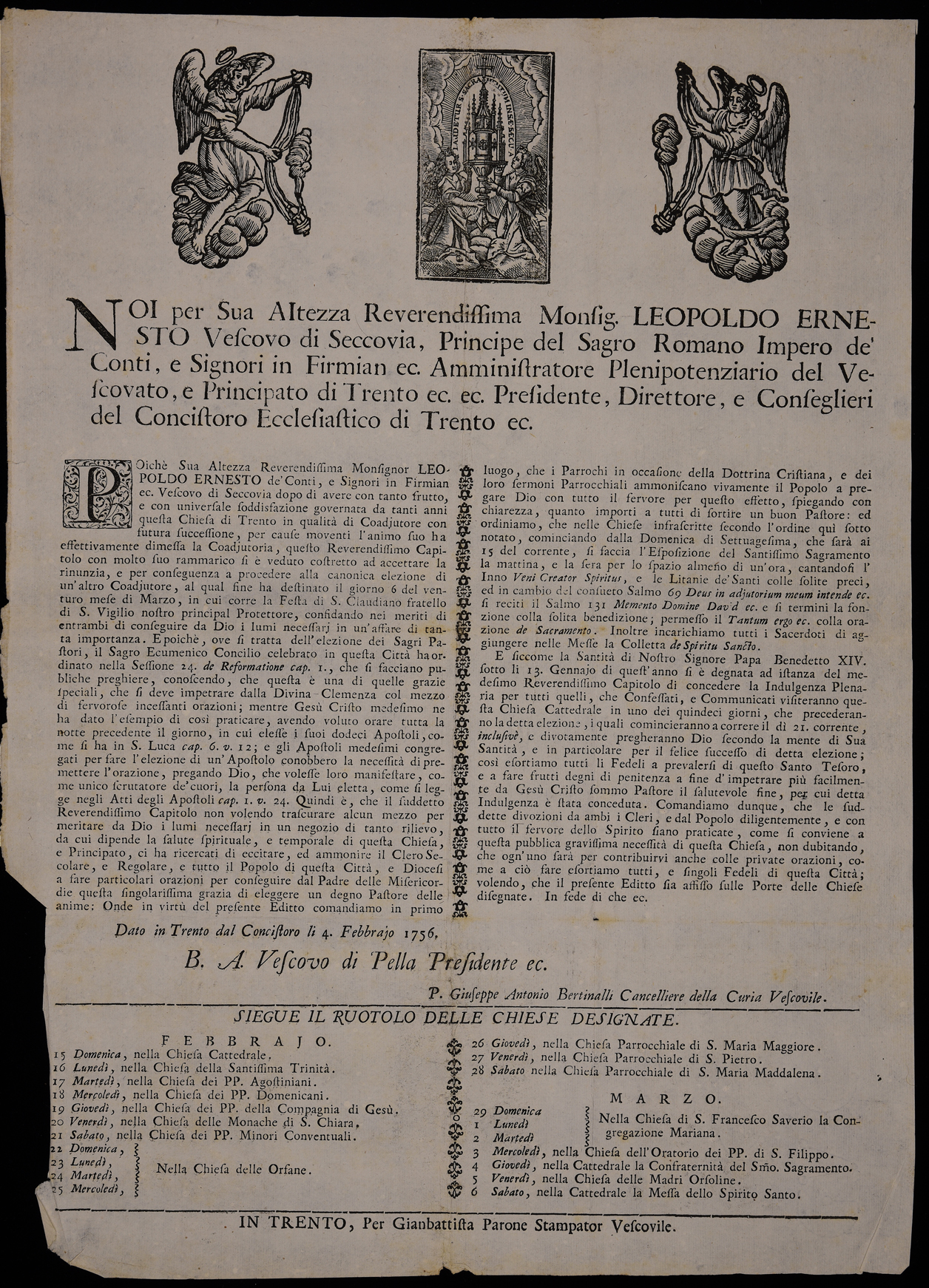 Proclama sull'elezione del nuovo coadiutore successore di Leopoldo Ernesto Firmian emanato il 4 febbraio 1756 dal Concistoro ecclesiastico di Trento, sottoscritto da Bartolomeo Antonio Passi vescovo di Pella (presidente) e da Giuseppe Antonio Bertinalli (cancelliere).