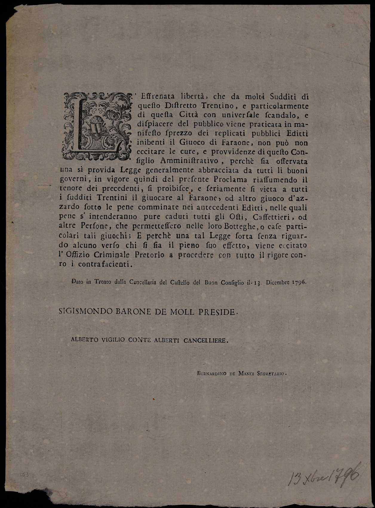 | L'effrenata libertà che da molti sudditi di questo distretto trentino e particolarmente di questa città ... |