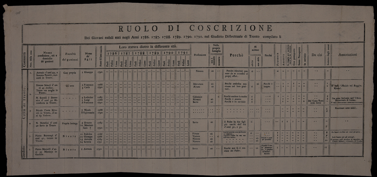 | Ruolo di coscrizione dei giovani nubili nati negli anni 1786, 1787, 1788, 1789, 1790, 1791 nel Giudizio distrettuale di Trento compilato li |