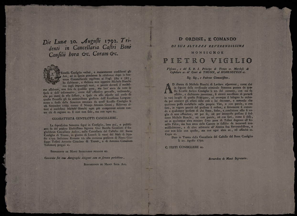 | D'ordine e comando di sua altezza reverendissima monsignor Pietro Vigilio vescovo e del S.R.I. principe di Trento ec. marchese di Castellaro ec. de' conti de Thunn ed Hohenstein ec. sig. sig. e padrone clementissimo |