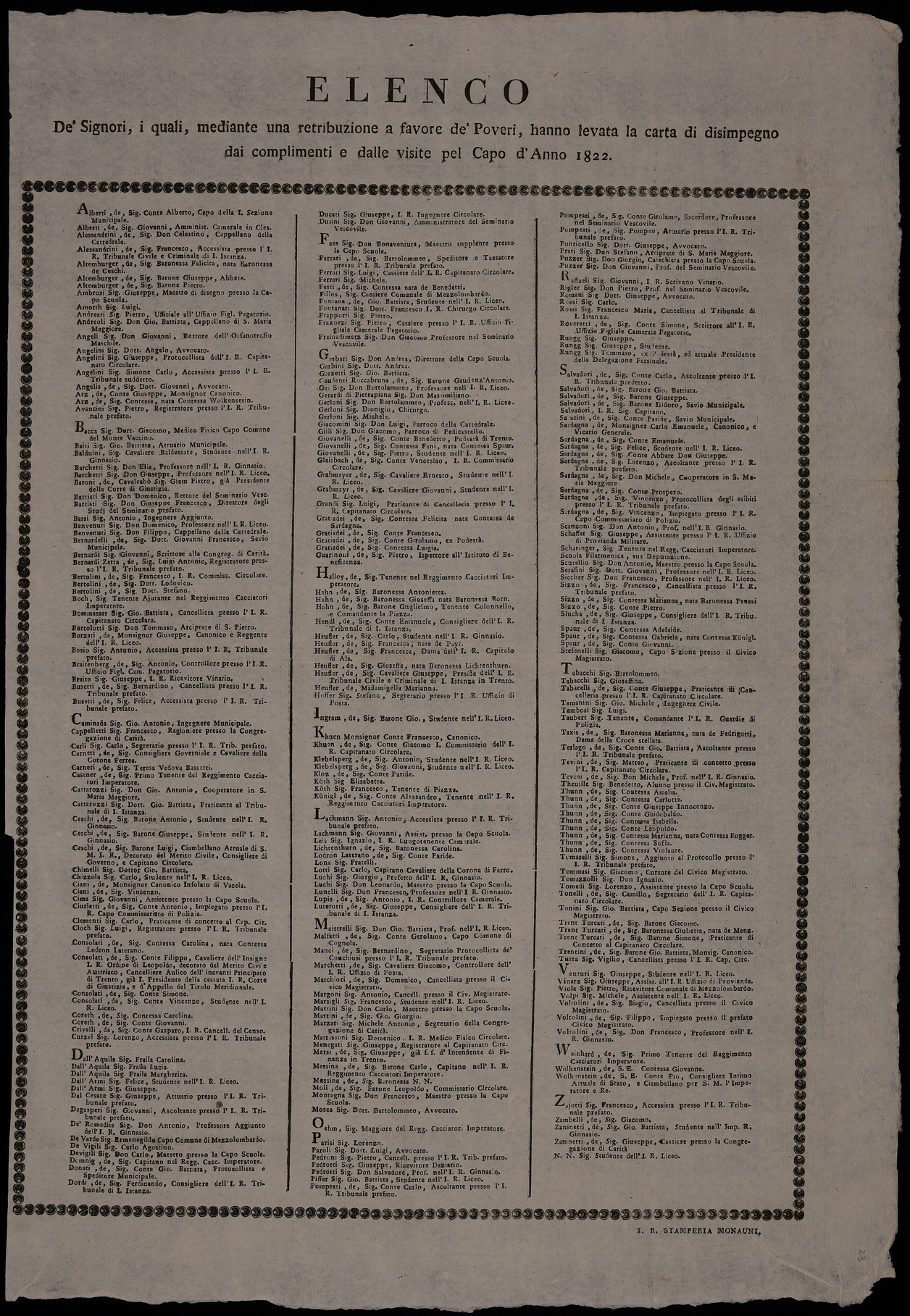 | Elenco de' signori i quali, mediante una retribuzione a favore de' poveri, hanno levata la carta di disimpegno dai complimenti e dalle visite pel capo d'anno 1822 |