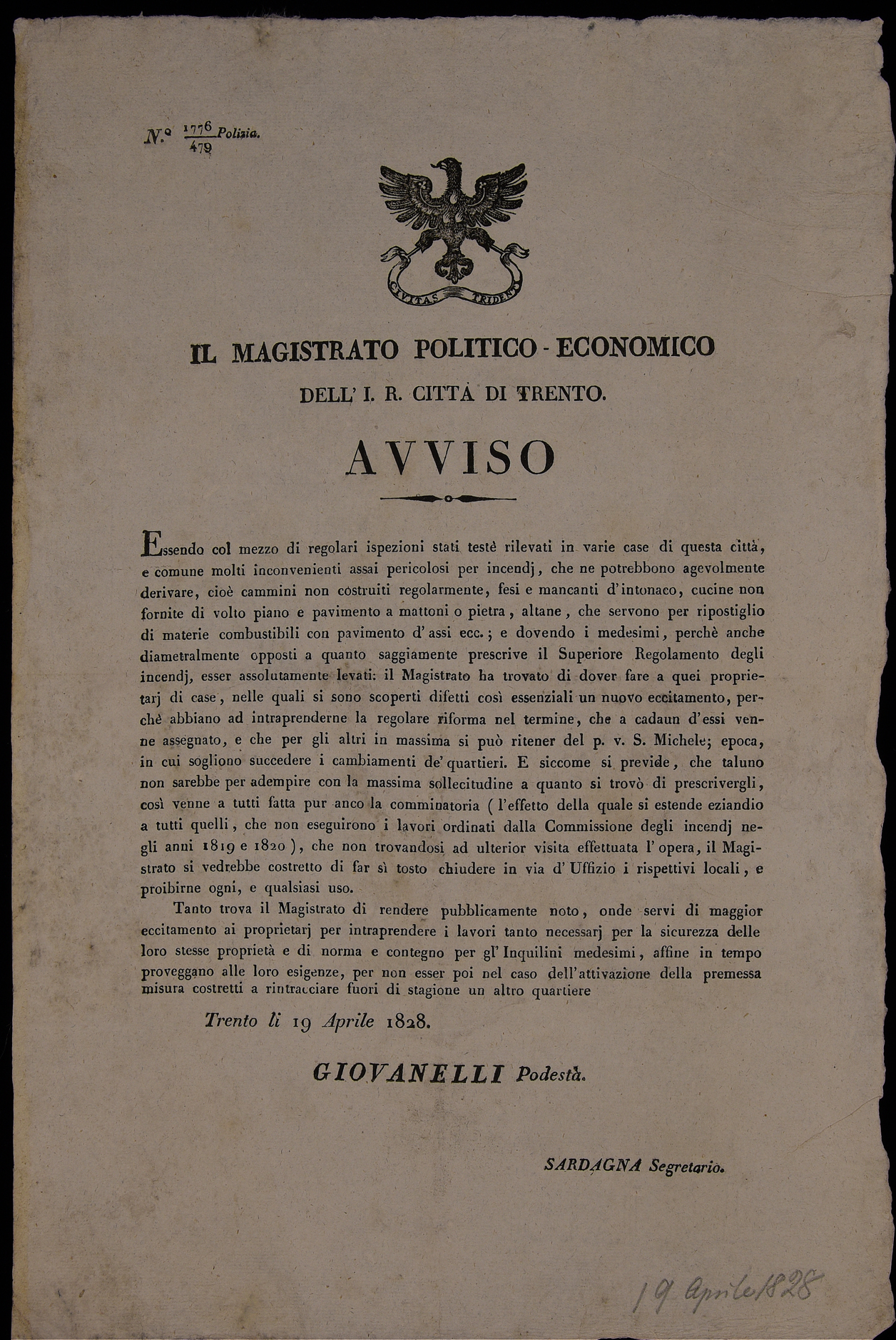 Il magistrato politico-economico dell'I.R. città di Trento. Avviso