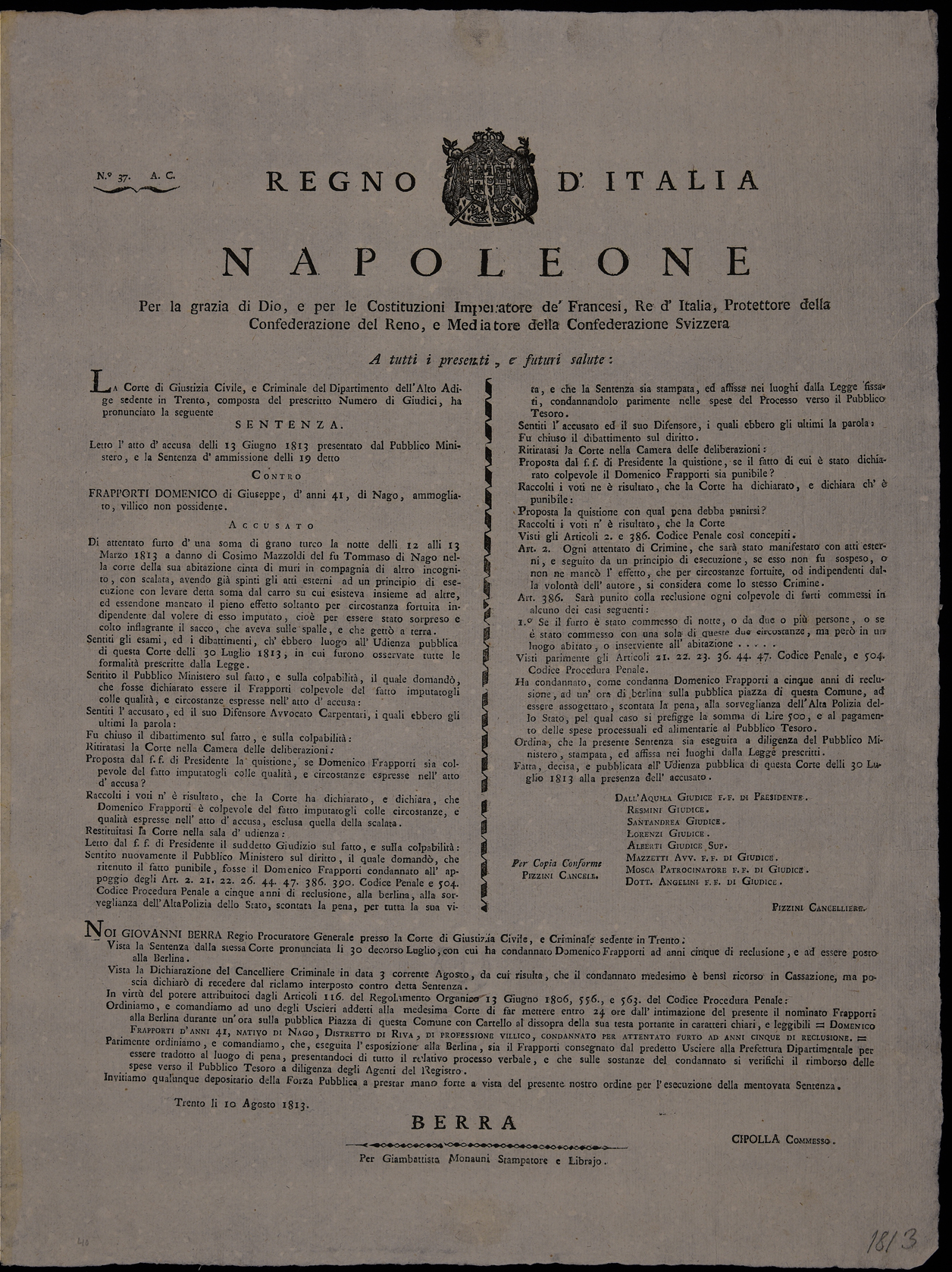La Corte di Giustizia civile e criminale del Dipartimento dell'Alto Adige sedente in Trento composta del prescritto numero di giudici ha pronunciato la seguente sentenza ...
