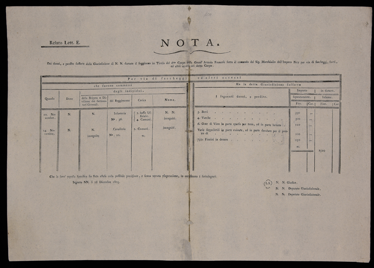 | Nota dei danni e perdite sofferte dalla giurisdizione di N.N. durante il soggiorno in Tirolo ... |