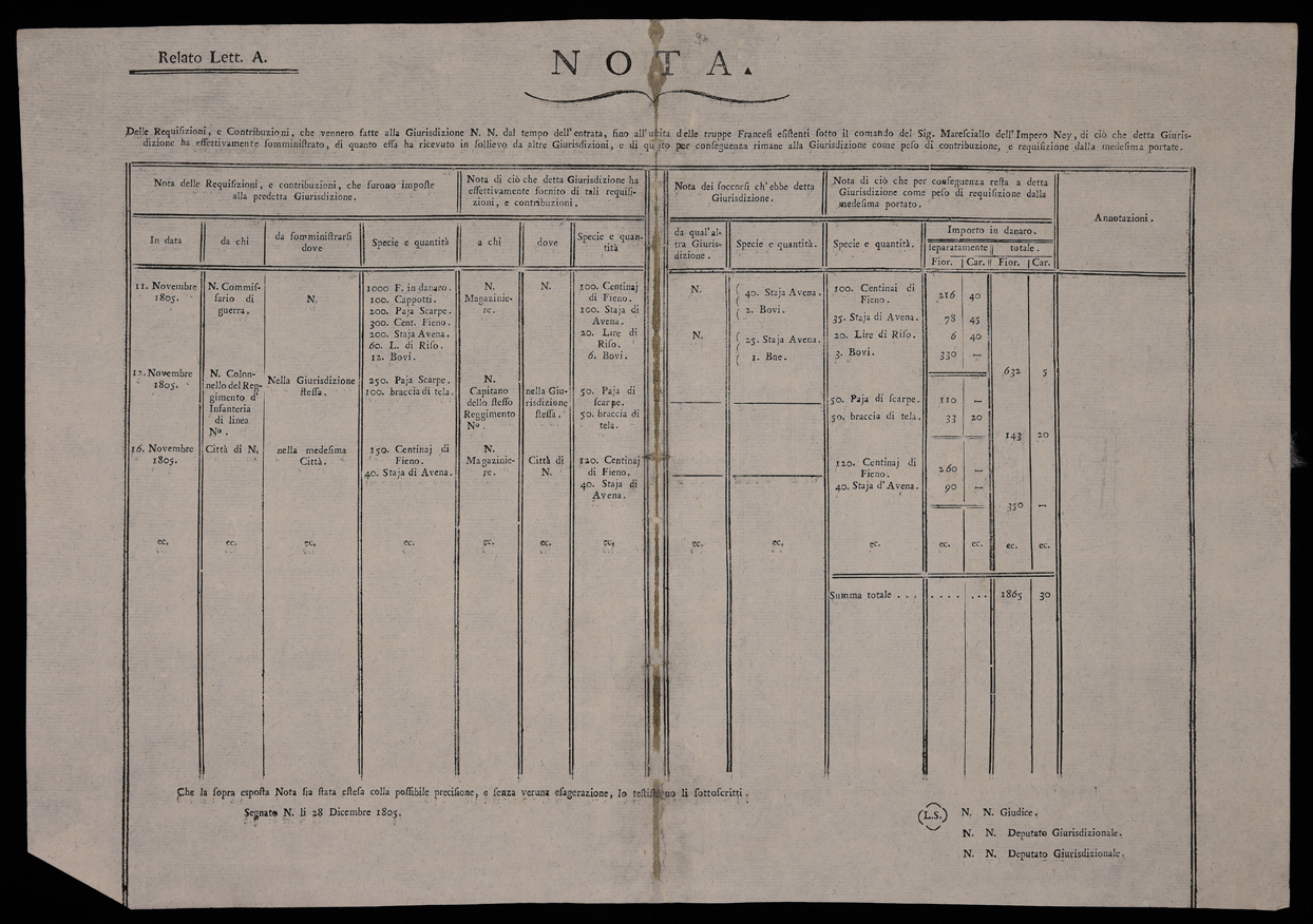 | Nota delle requisizioni e contribuzioni, che vennero fatte alla giurisdizione N.N. dal tempo dall'entrata fino all'uscita delle truppe francesi esistenti sotto il comando del sig. maresciallo dell'Impero Ney ... |