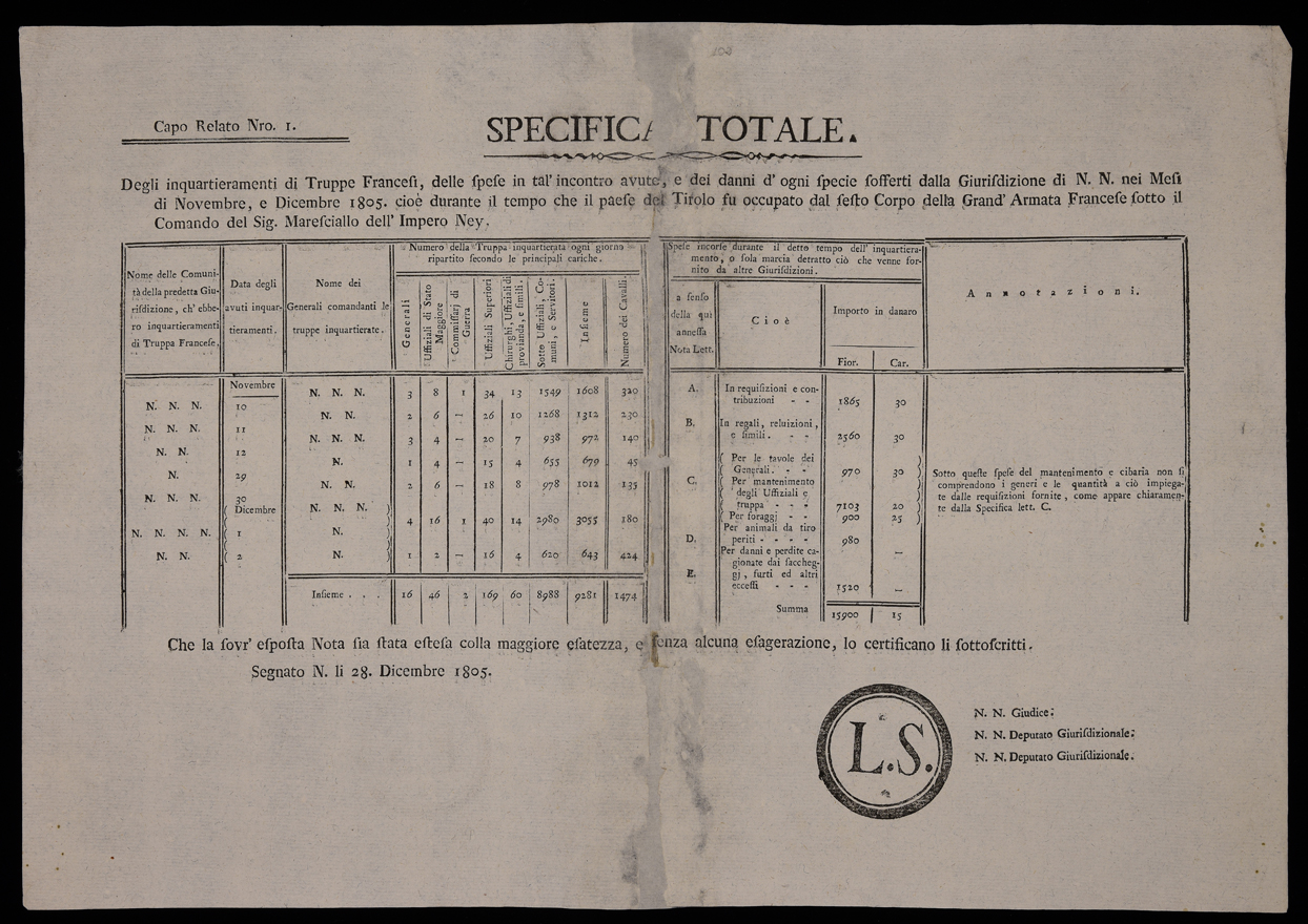 | Specifica totale degli inquartieramenti di truppe francesi, delle spese in tal'incontro avute, e dei danni d'ogni specie sofferti dalla giurisdizione di N.N. nei mesi di novembre, e dicembre 1805. ... |
