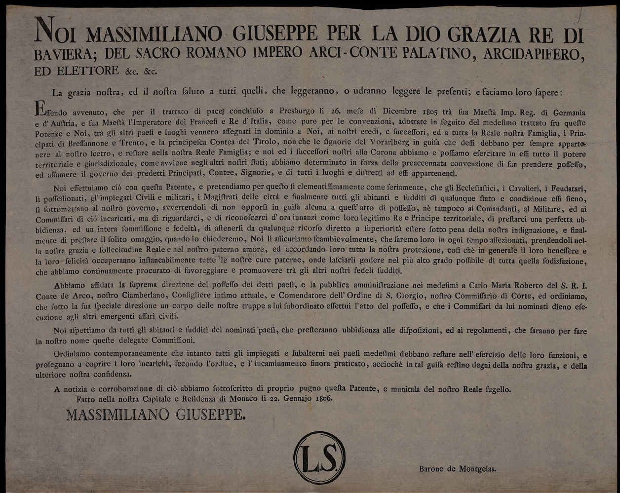 | Noi Massimiliano Giuseppe per la Dio grazia re di Baviera, del Sacro Romano Impero arci-conte palatino, arcidapifero, ed elettore &c. &c. |
