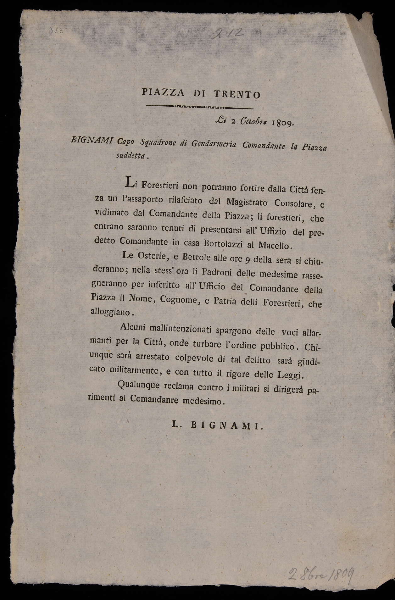 | Piazza di Trento, li 2 ottobre 1809. Bignami capo squadrone di gendarmeria comandante la piazza suddetta |