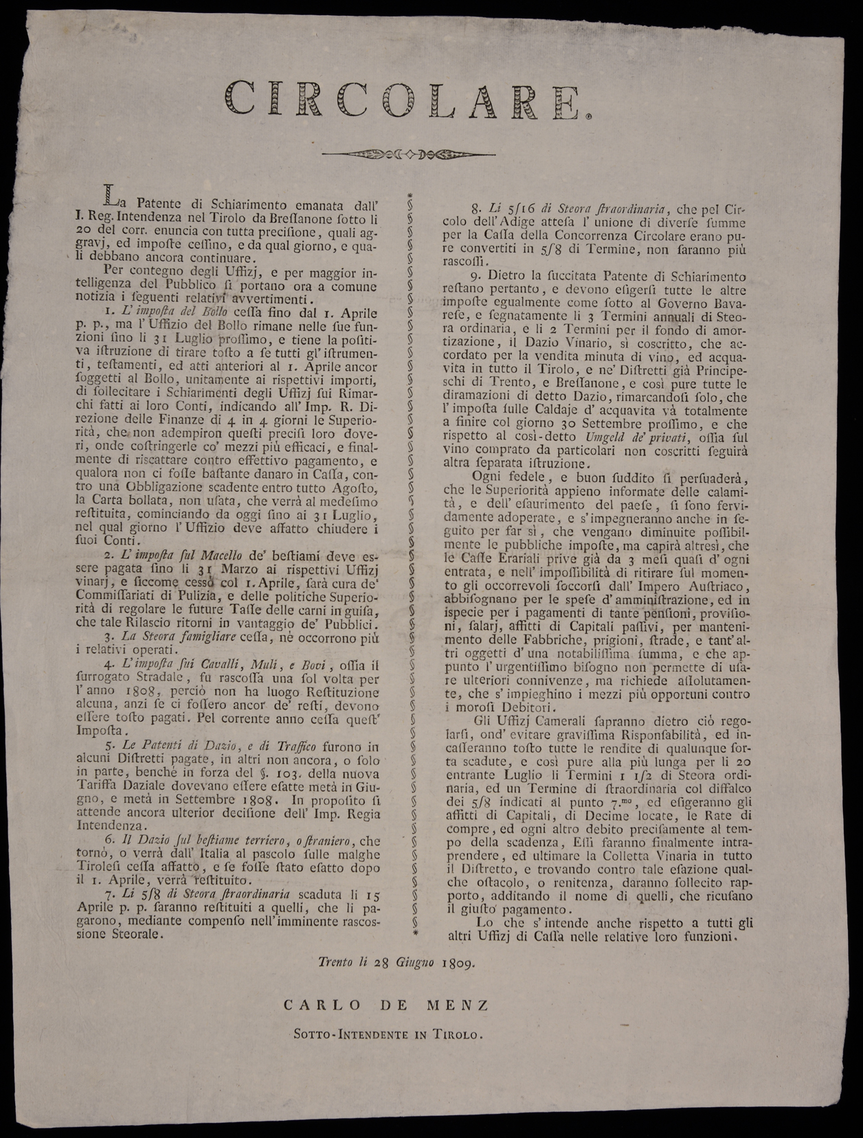 La patente di schiarimento emanata dall'I. Reg. Intendenza nel Tirolo da Bressanone sotto li 20 del corr. enuncia con tutta precisione quali aggravi ed imposte cessino e da qual giorno e quali debbano ancora continuare ...