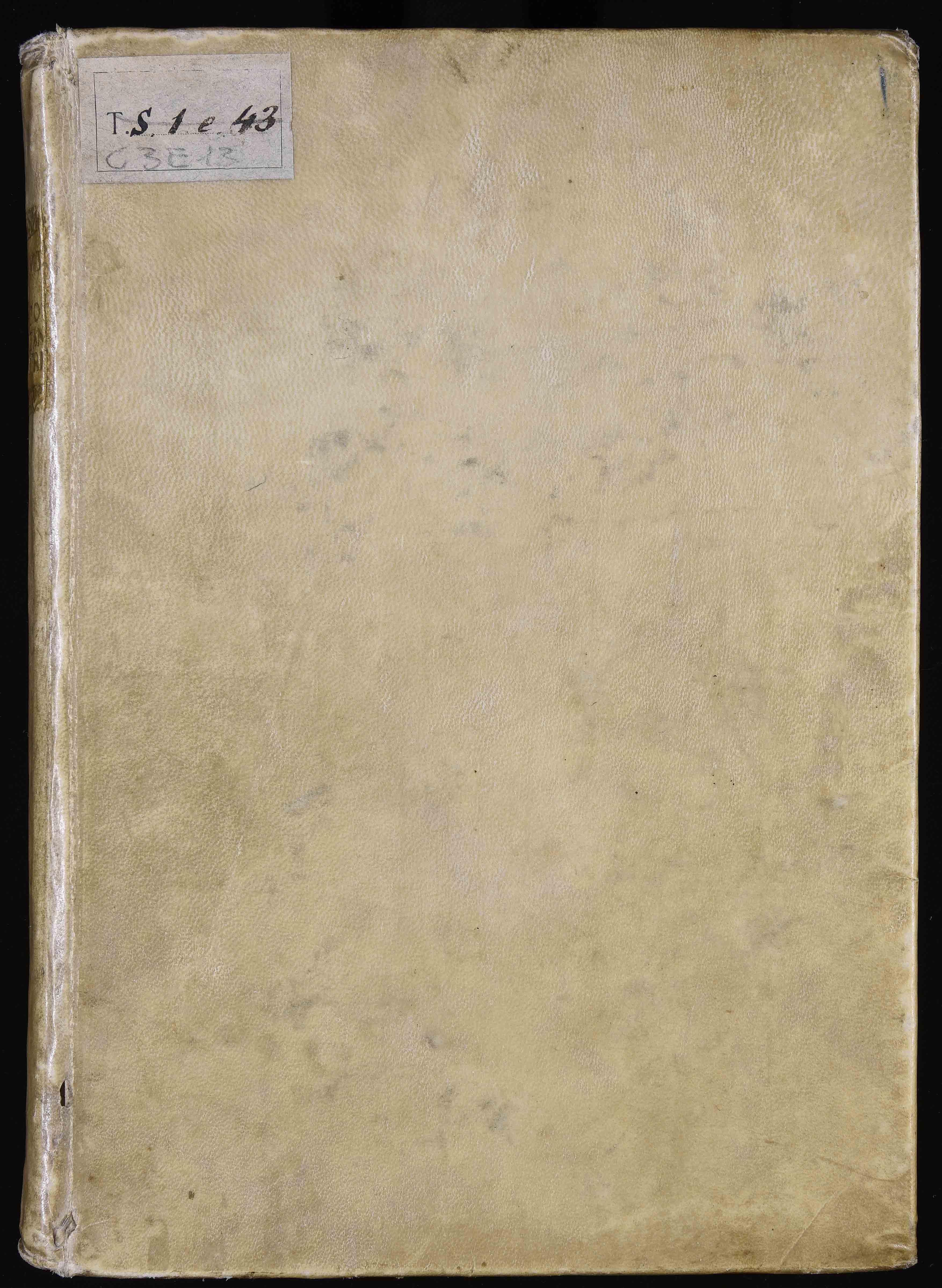 Legatura in pergamena rigida del XVII sec., 220x150x10 mm. Sul frontespizio, note ms. illeggibili. Antiche segnature di collocazione: 2168, 952, T.S. 1 e 43, G 2 e 107