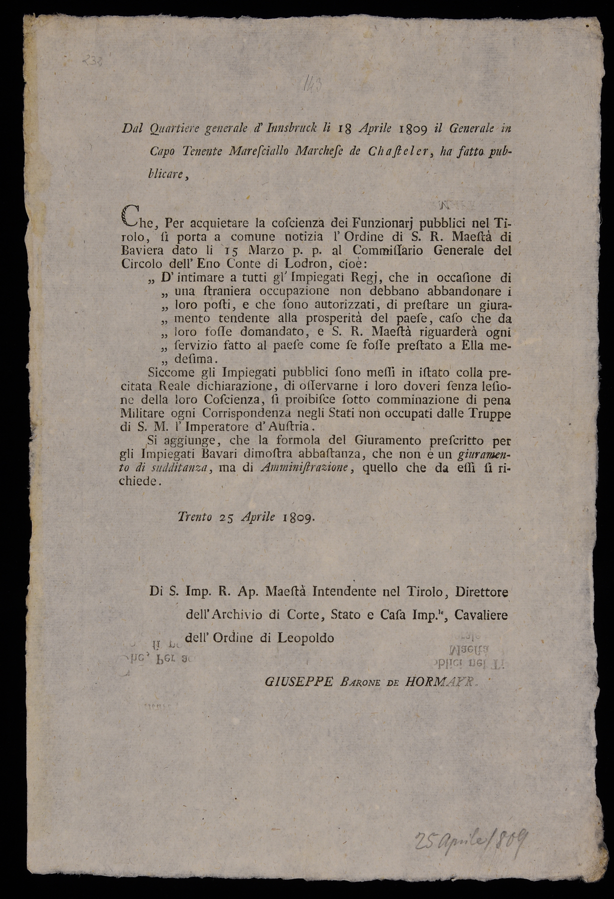 | Dal Quartiere generale d'Innsbruck li 18 aprile 1809 il generale in capo tenente maresciallo marchese de Chasteler, ha fatto pubblicare ... |