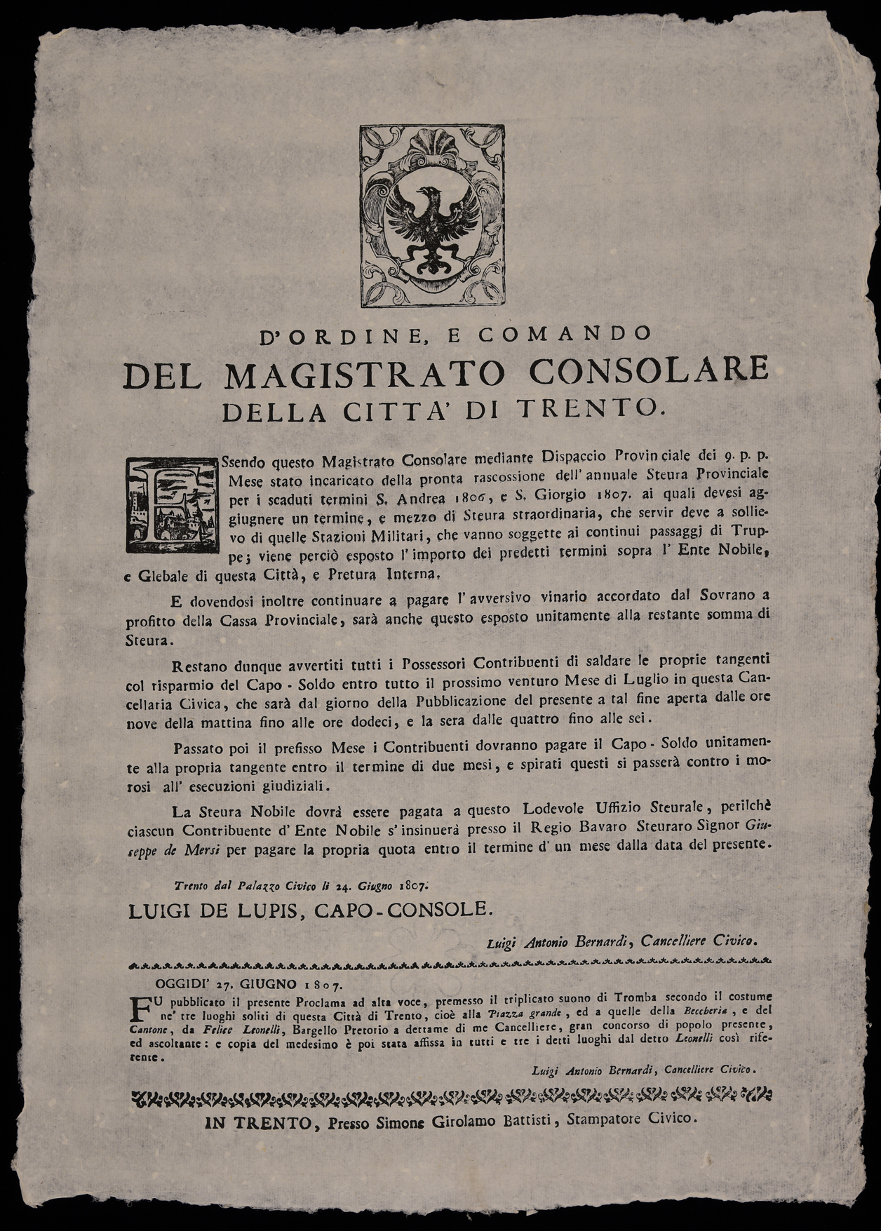 | D'ordine e comando del Magistrato consolare della città di Trento |