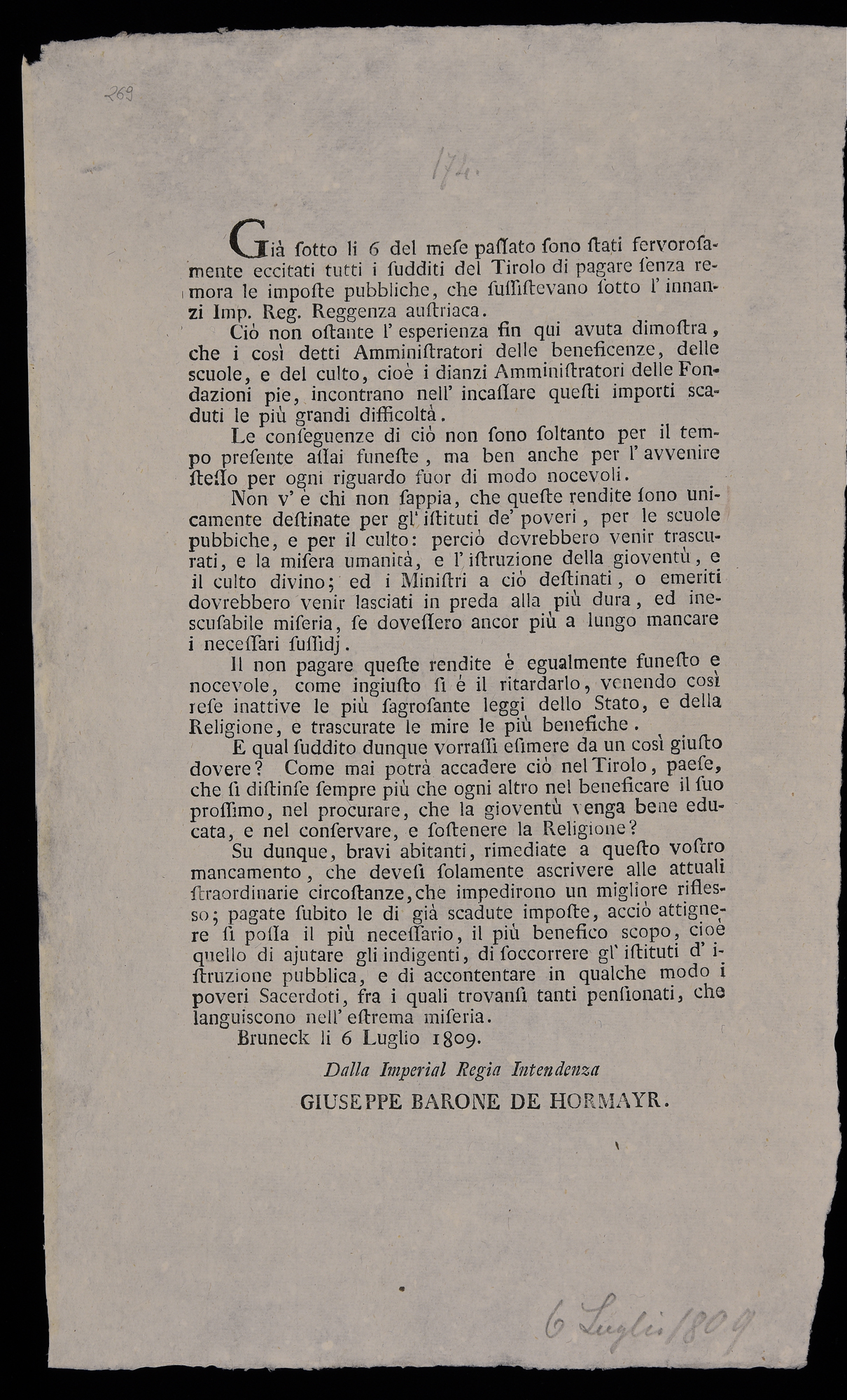 | Già sotto li 6 del mese passato sono stati fervorosamente eccitati tutti i sudditi del Tirolo di pagare senza remora le imposte pubbliche ... |