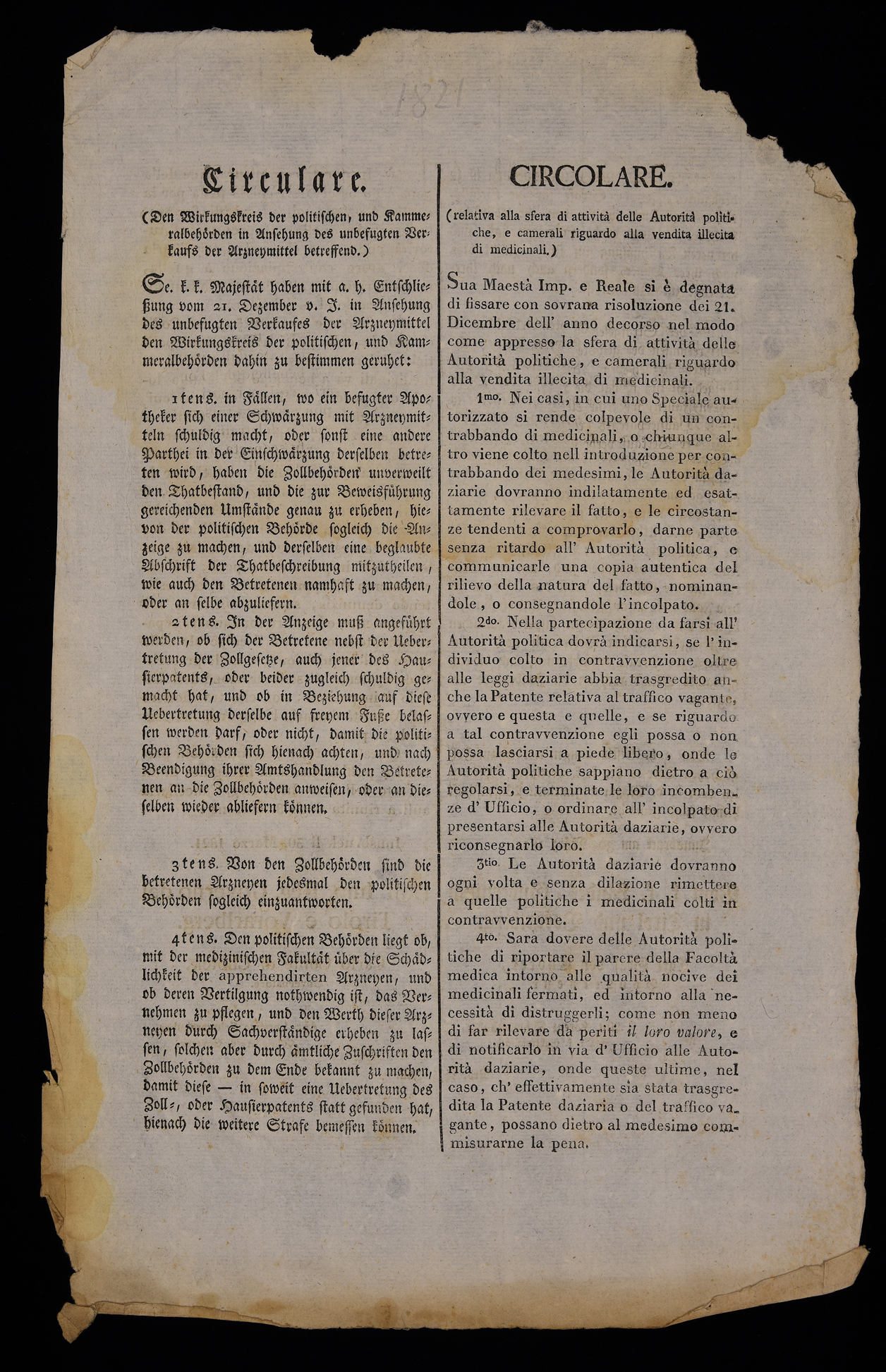 | Circulare (den Wirkungskreis der politischen und Kammeralbehörden in Ansehung des unbefugten Verkaufs der Arzneymittel betreffend) |