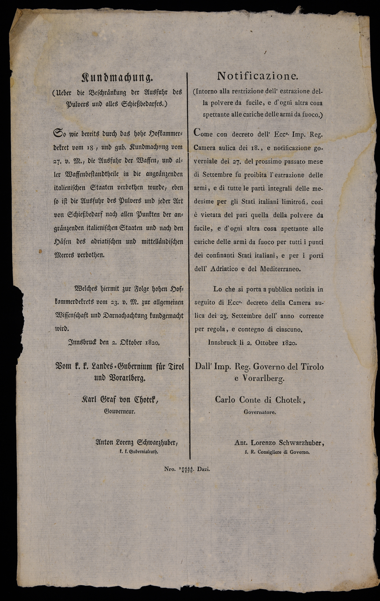 | Kundmachung (ueber die Beschränkung der Ausfuhr des Pulvers und alles Schiessbedarfes) |