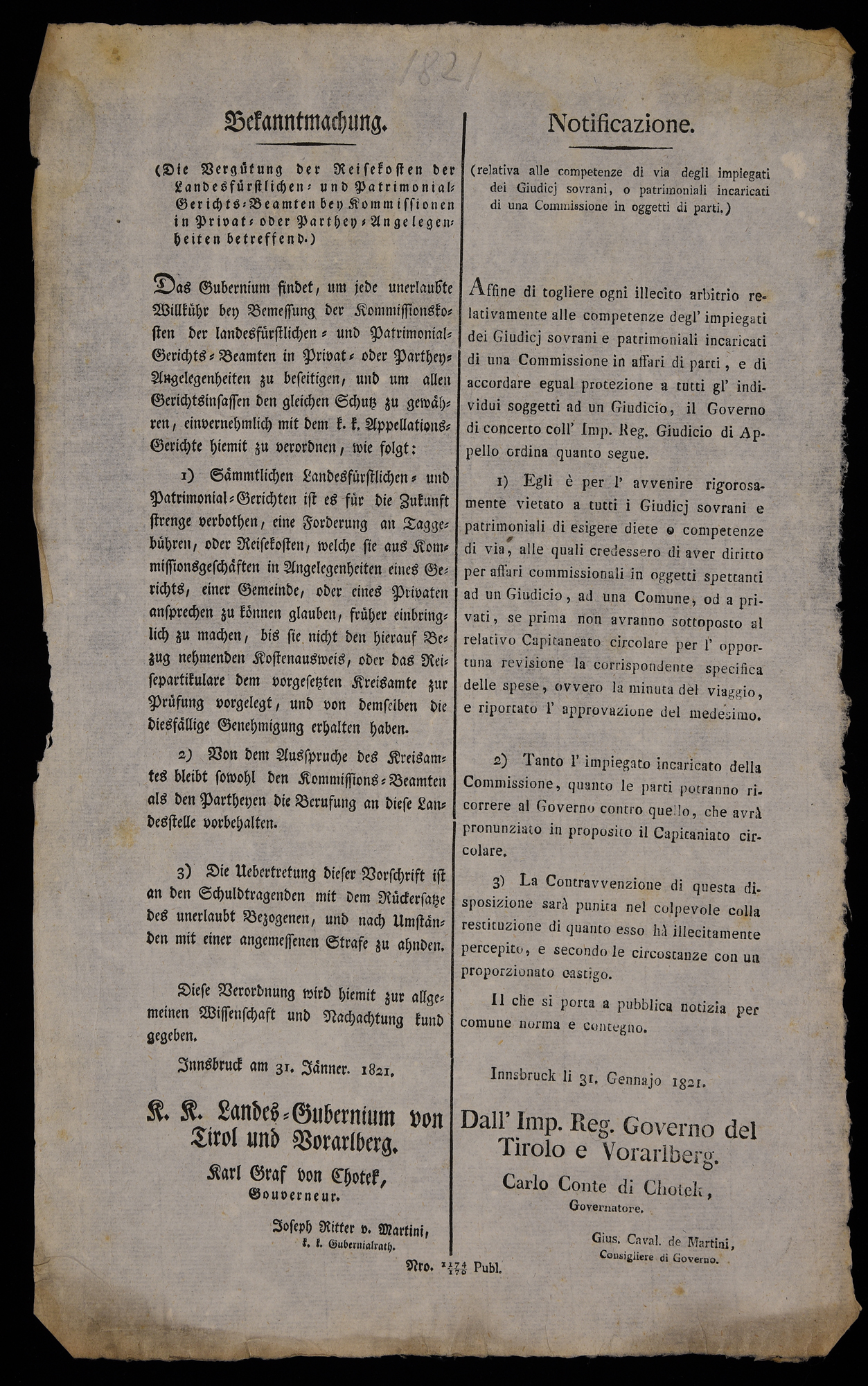 | Bekannmachung (die Vergütung der Reisekosten der Landesfürstlichen-und Patrimonial-Gerichts-Beamten bey Kommissionen in Privat-oder Parthen-Angelegenheiten betreffend) |