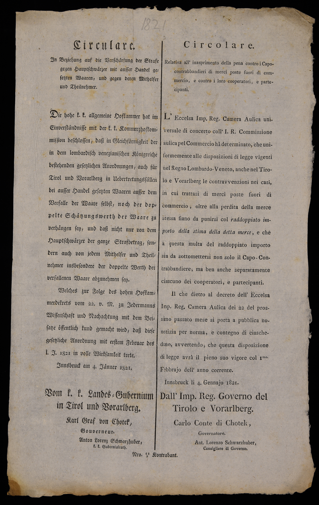| Circulare in Beziehung auf die Verschärfung der Strafe gegen Hauptschwärzer mit ausser Handel gesetzen Waaren und gegen deren Mithelfer und Theilnehmer |