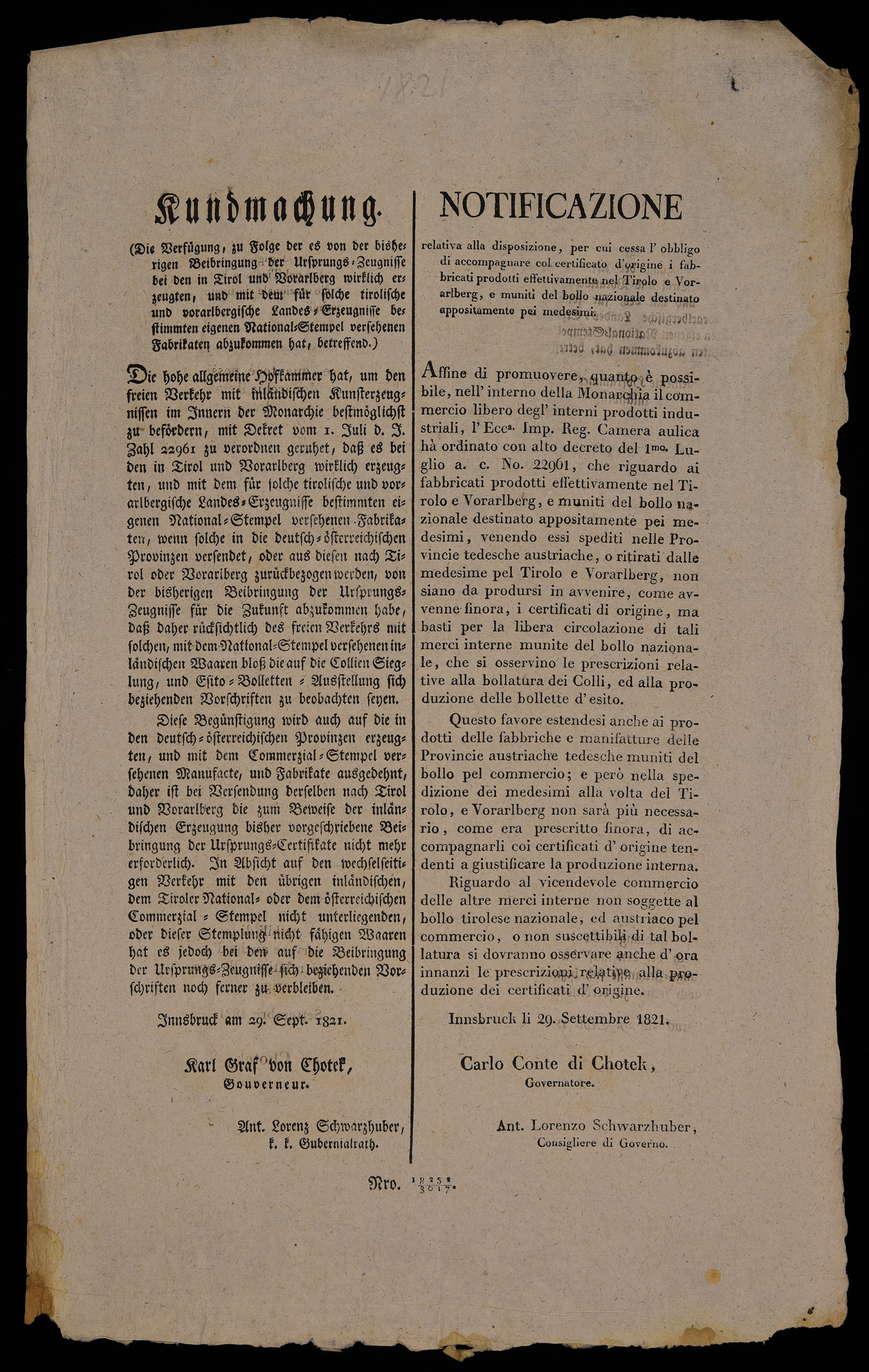 | Kundmachung (die Verfügung, zu Folge der es von der bisherigen Beibringung der Ursprungs-Zeugnisse bei den in Tirol und Vorarlberg wirklich erzeugten und mit dem für solche tirolische und vorarlbergische Landes-Erzeugnisse bestimmten eigenen National-Stempel versehenen fabrikaten abzukommen hat, betreffend |