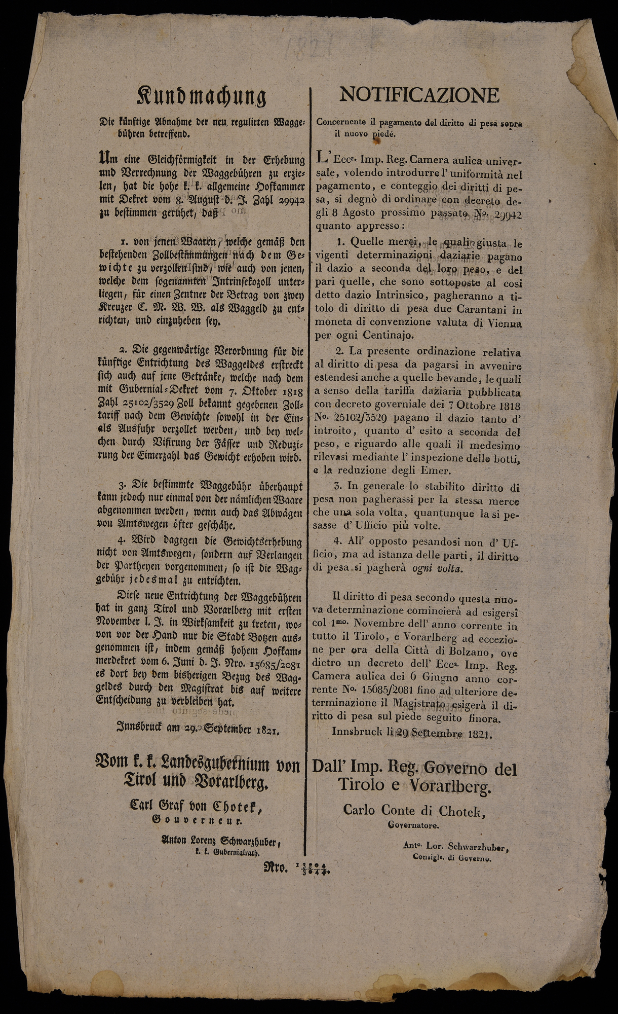 | Kundmachung die künstige Abnahme der neu regulirten Waggebühren betreffend |