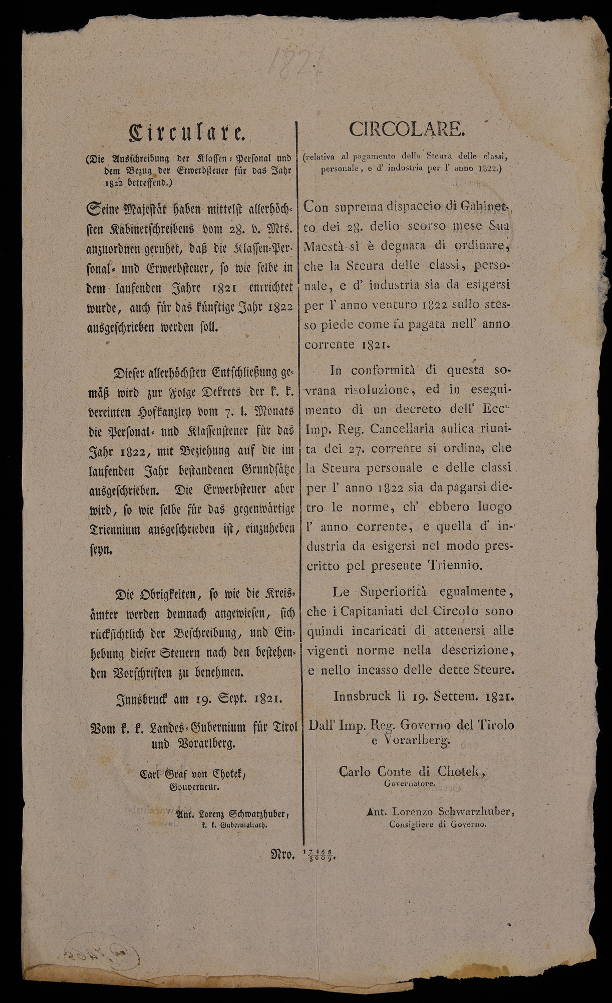 | Circulare (die Ausschreibung der Klassen-Personal und dem Bezug der Erwerbsteuer für das Jahr 1822 betreffend) |