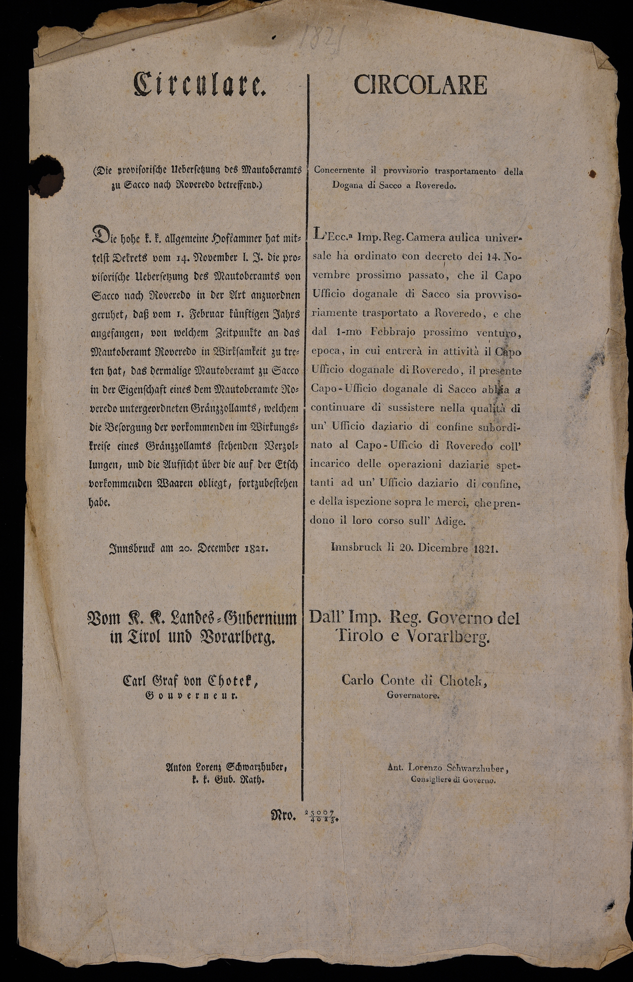 Circulare (die provisorische Uebersetzung des Mautoberamts zu Sacco nach...