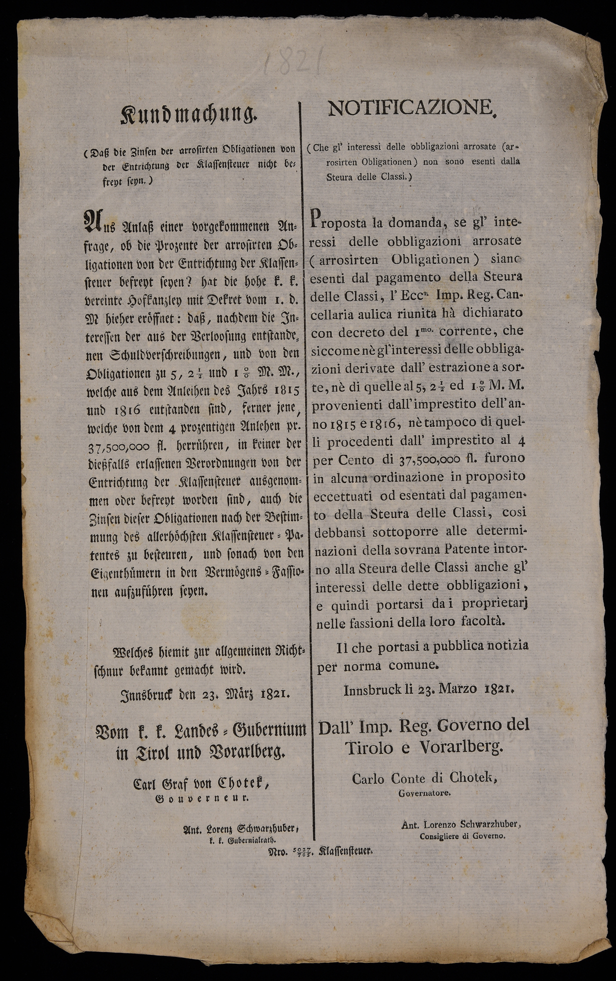 | Kundmachung (dass die Zinsen der arrosirten Obligationen von der Entrichtung der Klassensteuer nicht befreyt seyn) |