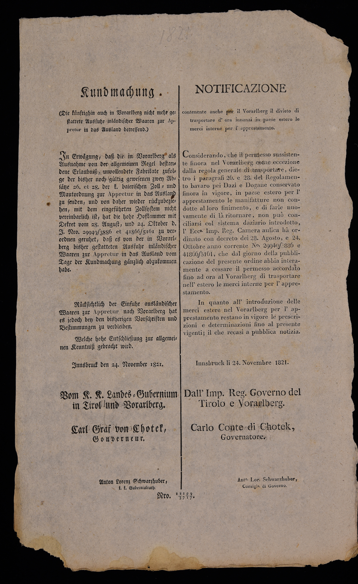 | Notificazione contenente anche per il Vorarlberg il divieto di trasportare d'ora innanzi in paese estero le merci interne per l'apprestamento |