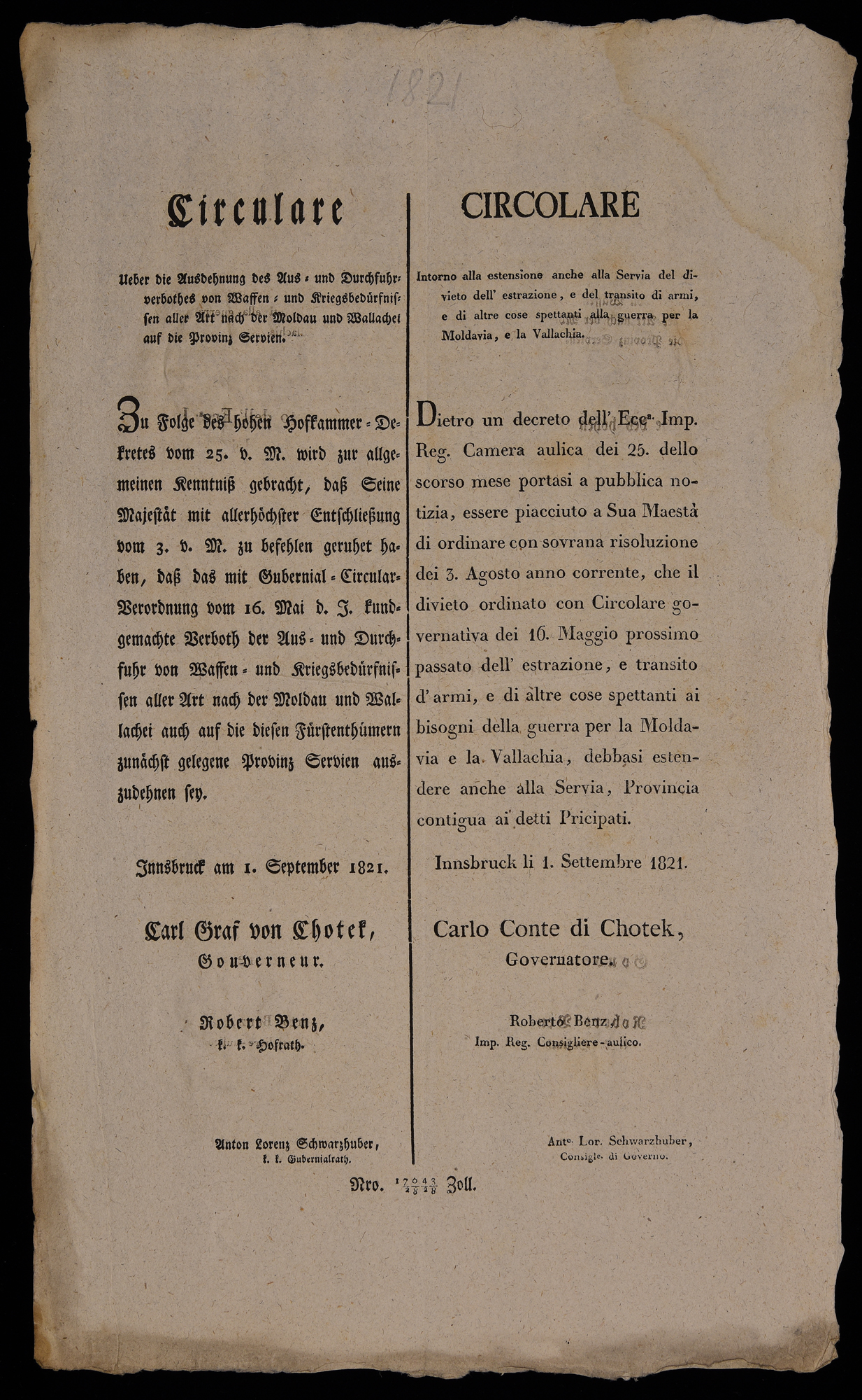 | Circulare ueber Ausdehnung des Aus-und Durchfuhrverbothes von Wassen-und Kriegsbedürfnissen aller Art nach der Moldau und Wallachei auf die Provinz Servien |