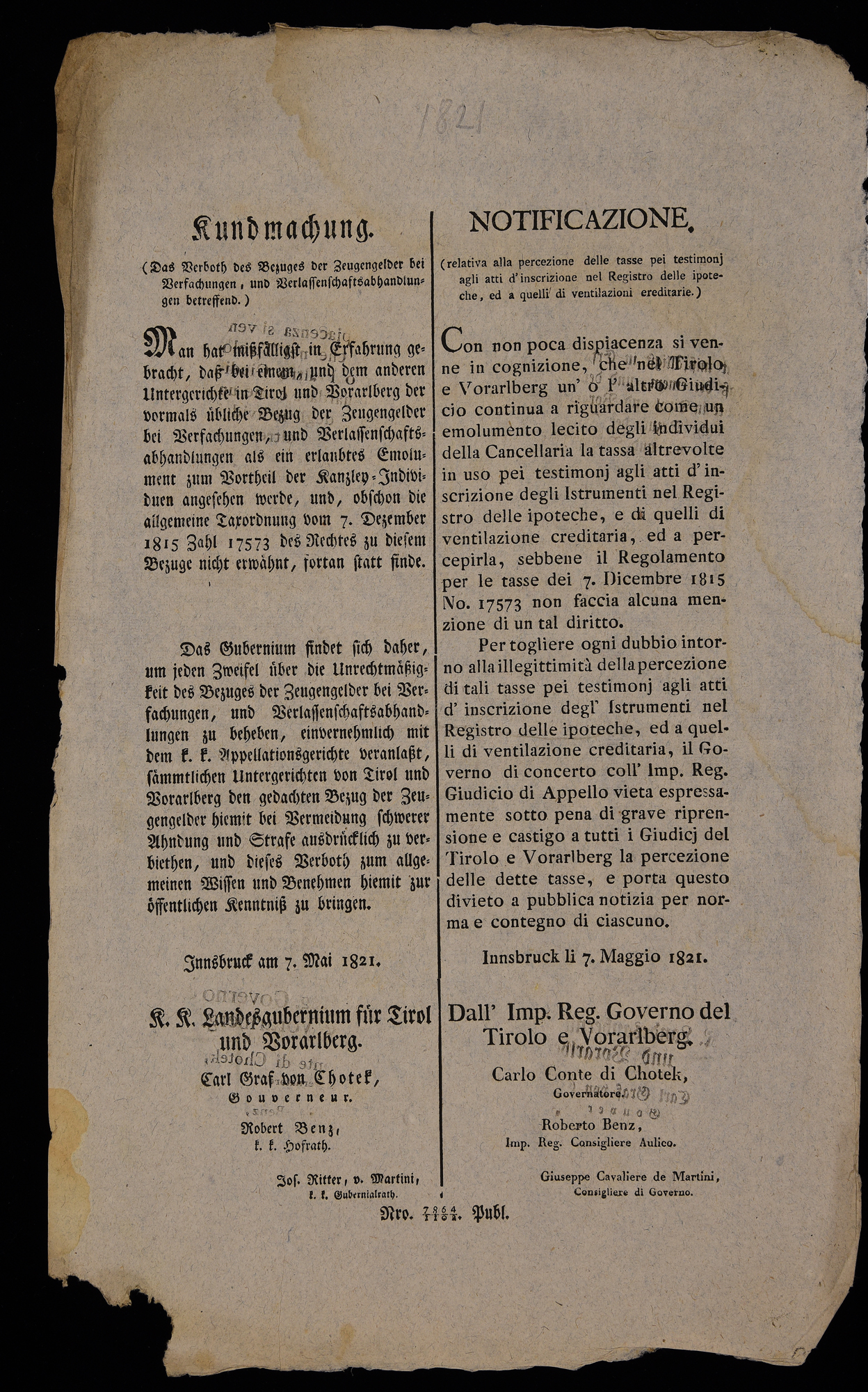 Kundmachung (das Verboth des Bezuges der Zeugengelder bei Verfachungen, und...