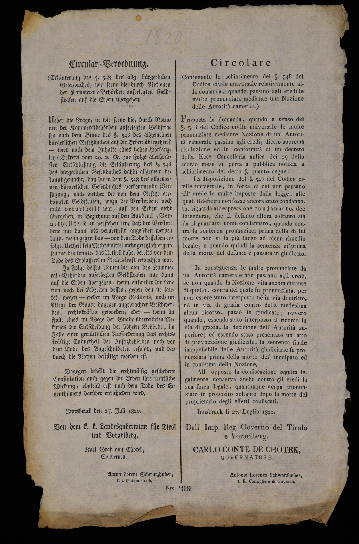 | Circular-Verordnung (Erläuterung des § 548 des allg. bürgerlichen Gesetzbuches, wie ferne die durch Notionen der Kammeral-Behörden auferlegten Geldstrafen auf die Erben übergehen |