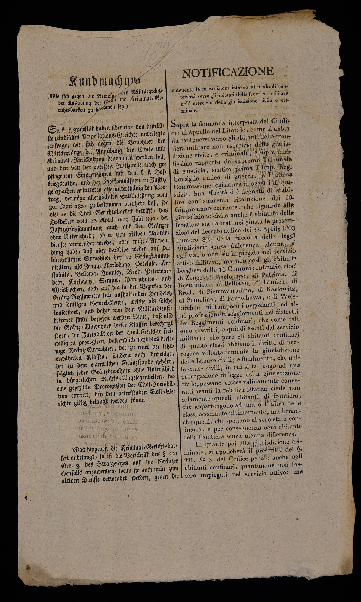 | Kundmachung (wie sich gegen die Bewohner der Militärgränze bei Ausübung der Civil-und Kriminal-Gerichtsbarkeit zu benehmen sey) |