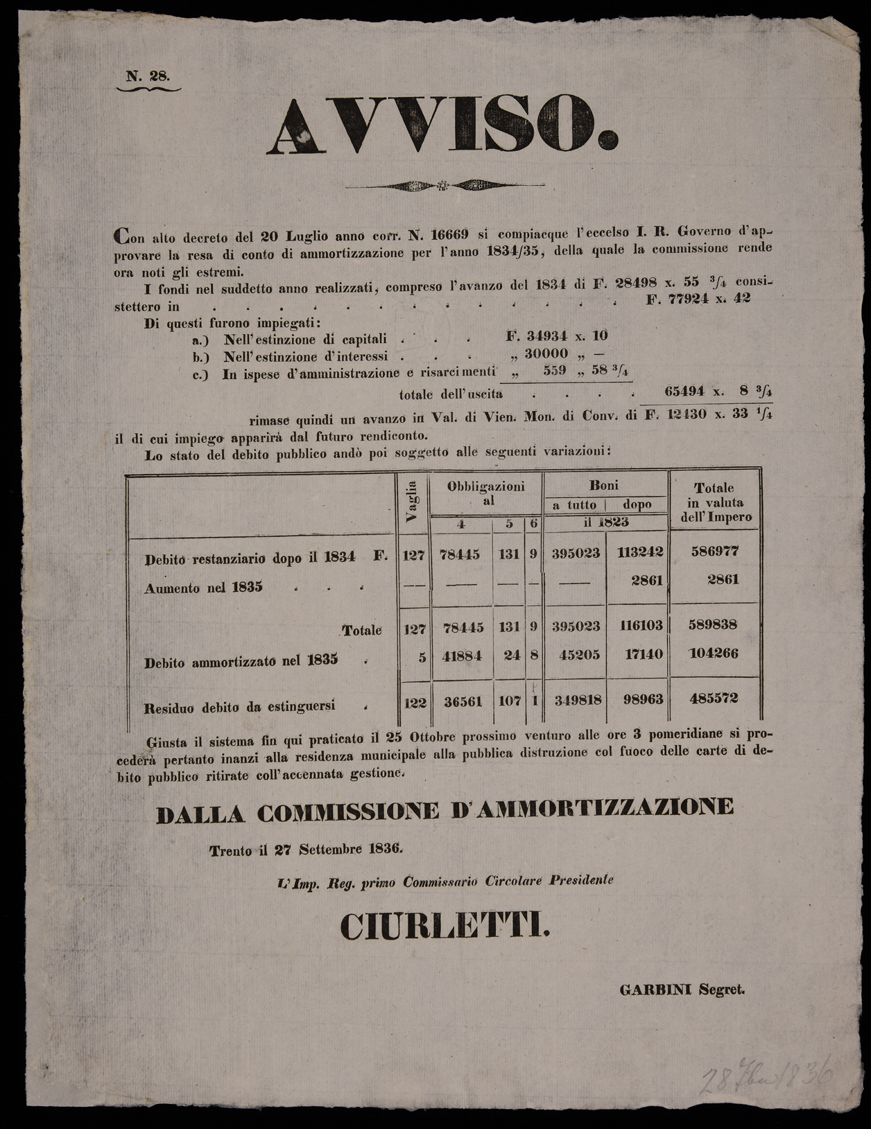 Con alto decreto del 20 luglio anno corr. n. 16669 si compiacque l'eccelso I.R. governo d'approvare la resa di conto di ammortizzazione per l'anno 1834/35 ...