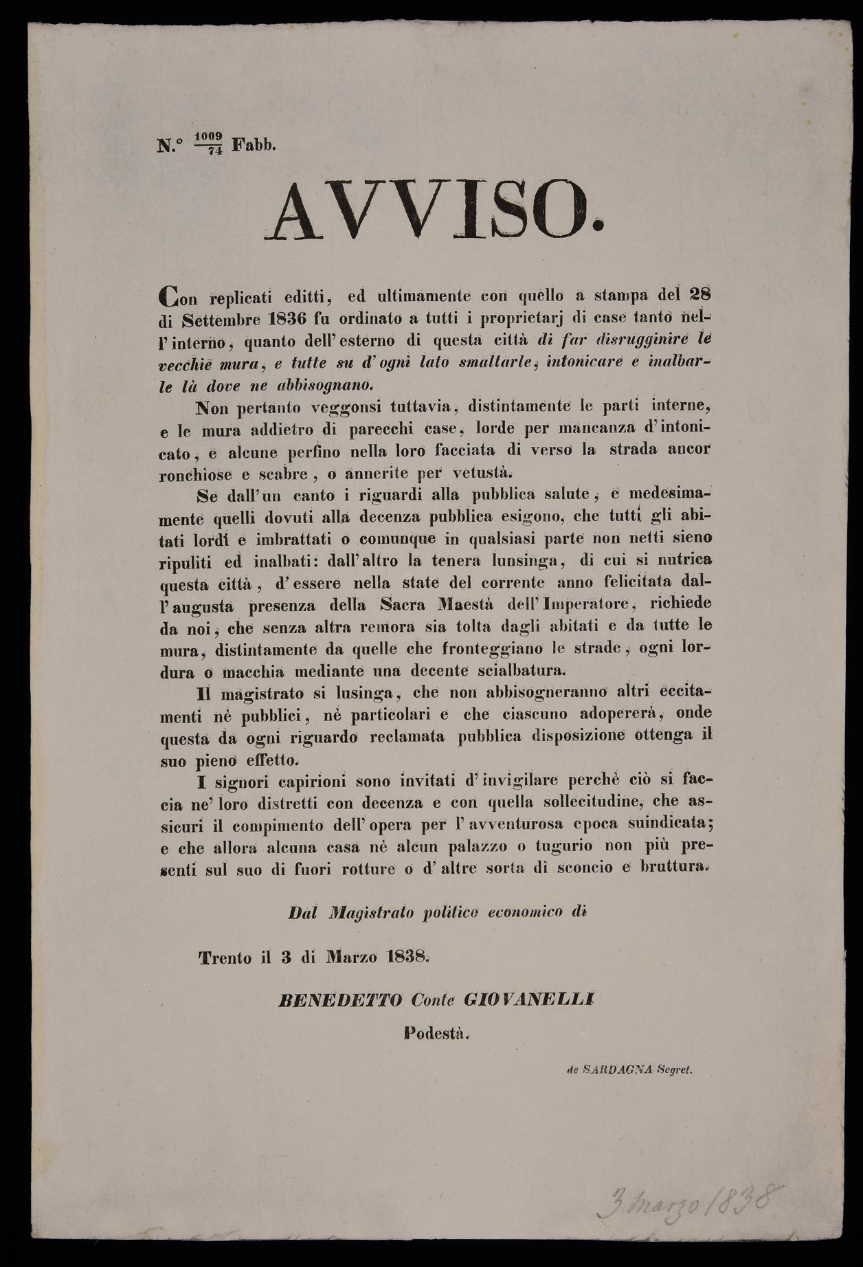 Con replicati editti, ed ultimamente con quello a stampa del 28 di settembre 1836 fu ordinato a tutti i proprietarj di case ... di far distrugginire le vecchie mura ...