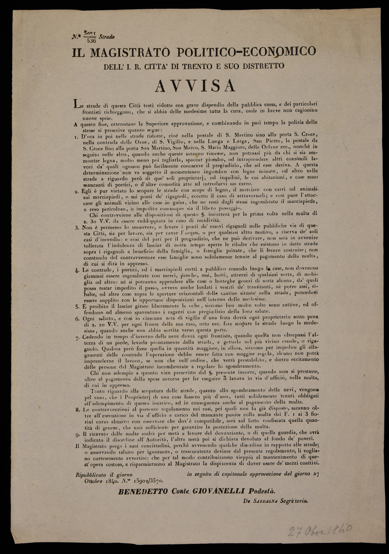 | Il magistrato politico-economico dell'I.R. città di Trento e suo distretto avvisa |