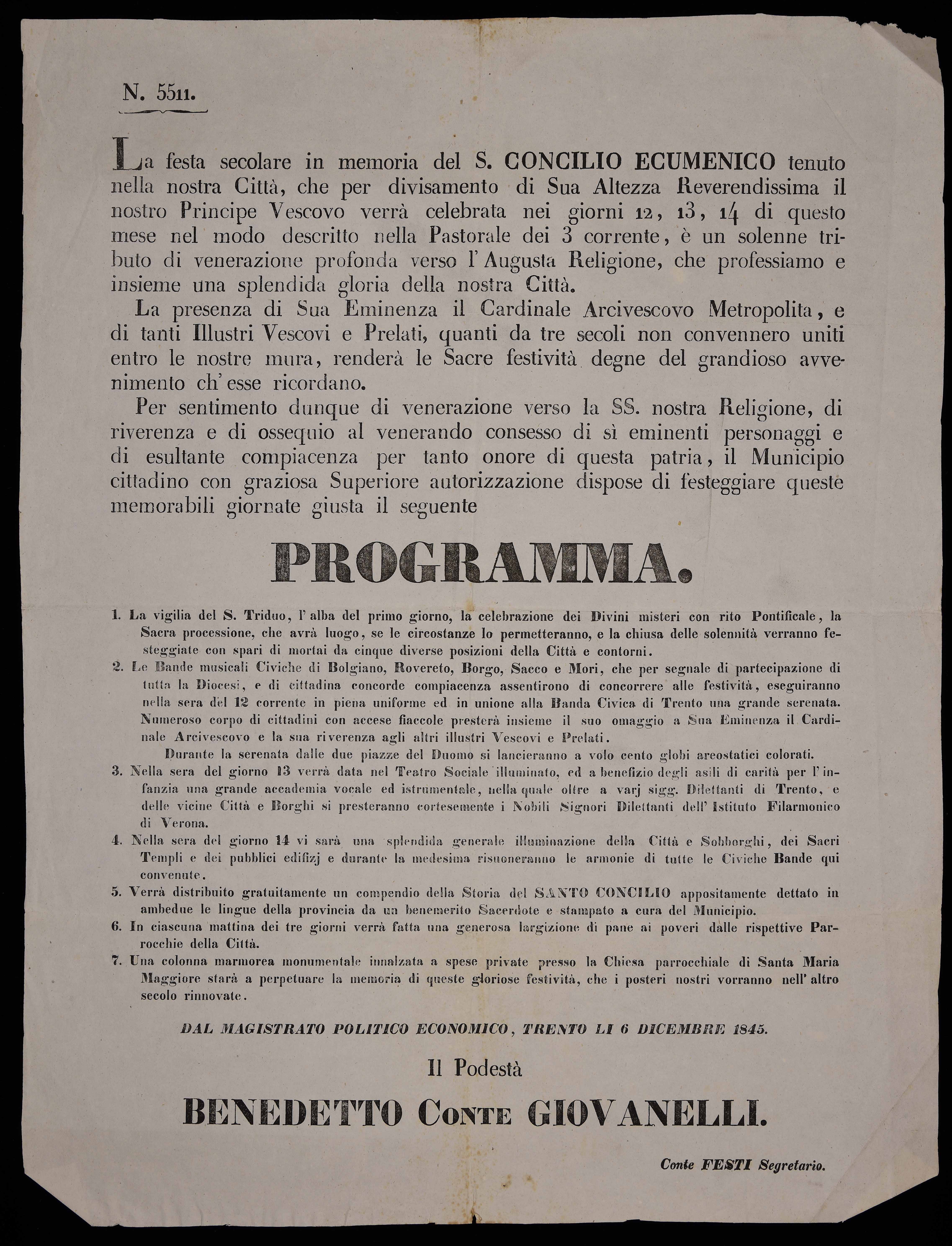 | La festa secolare in memoria del s. concilio ecumenico tenuto nella nostra città … per sentimento dunque di venerazione verso la nostra SS. religione … il municipio cittadino con graziosa superiore autorizzazione dispose di festeggiare queste memorabili giornate giusta il seguente programma |