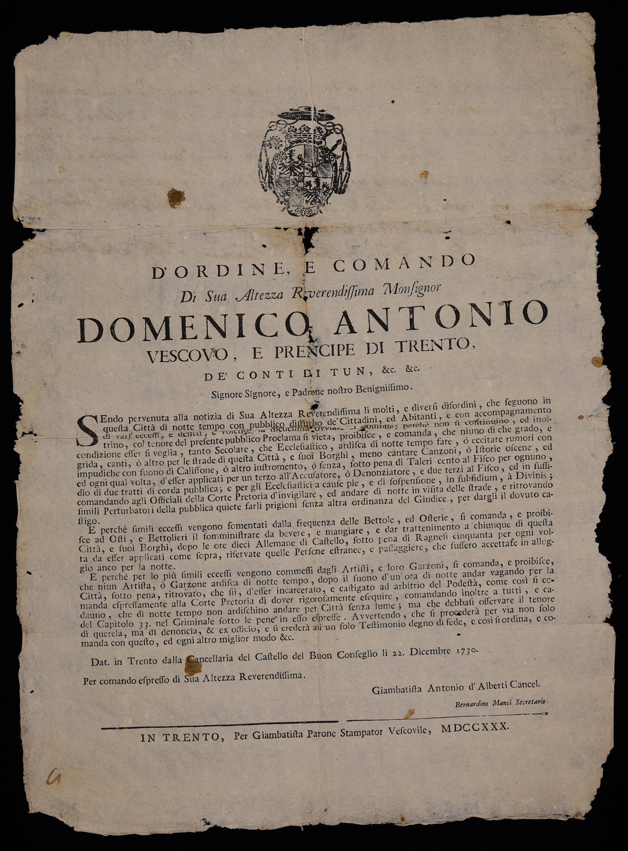 Proclama che vieta rumori e schiamazzi notturni emanato il 22 dicembre 1730 da Domenico Antonio Thun, principe-vescovo di Trento, stemma di Domenico Antonio Thun.