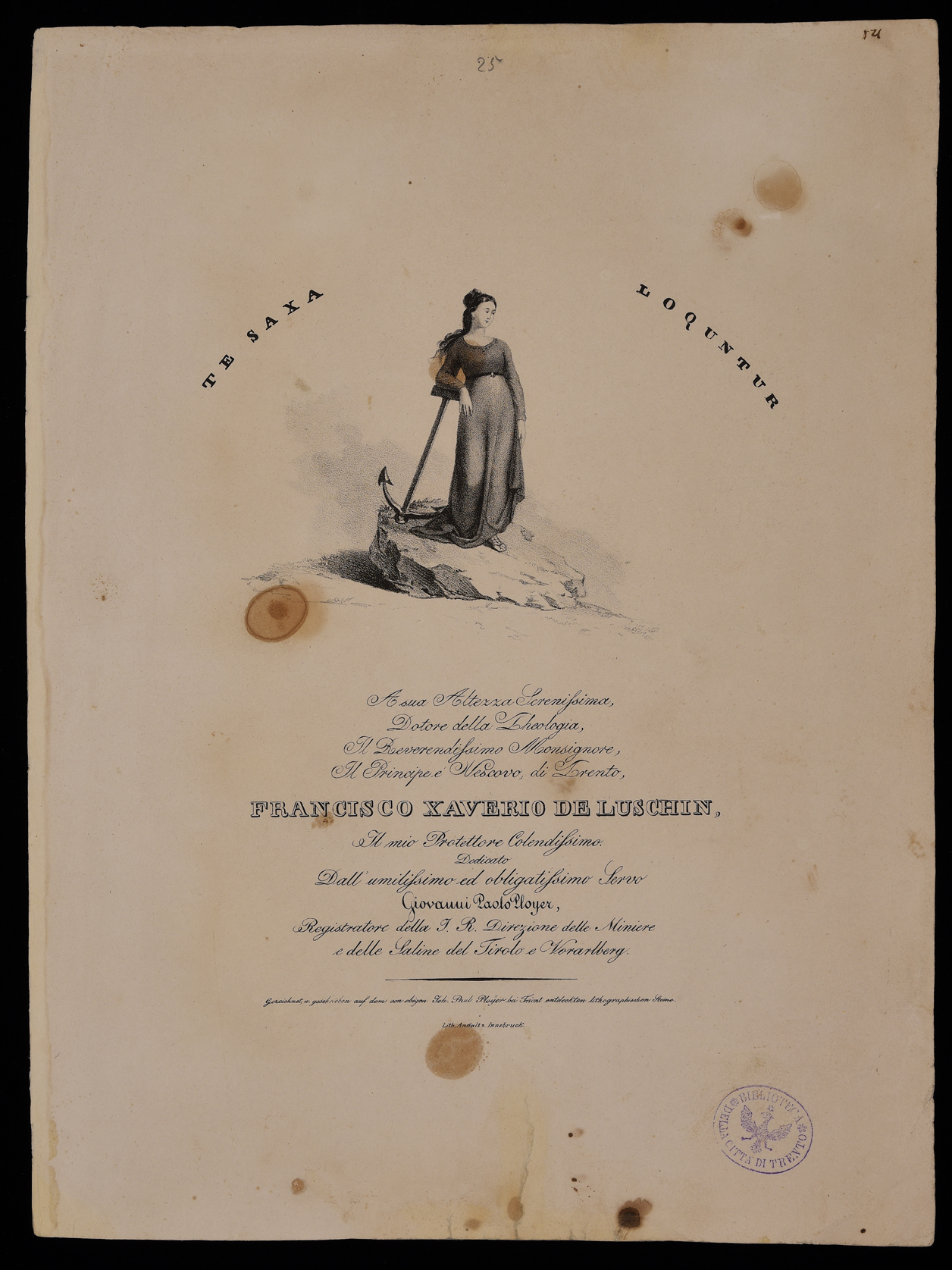 | A sua altezza serenissima, dotore della theologia, al reverendissimo monsignore, il principe e vescovo, di Trento, Francisco Xaverio de Luschin ... |