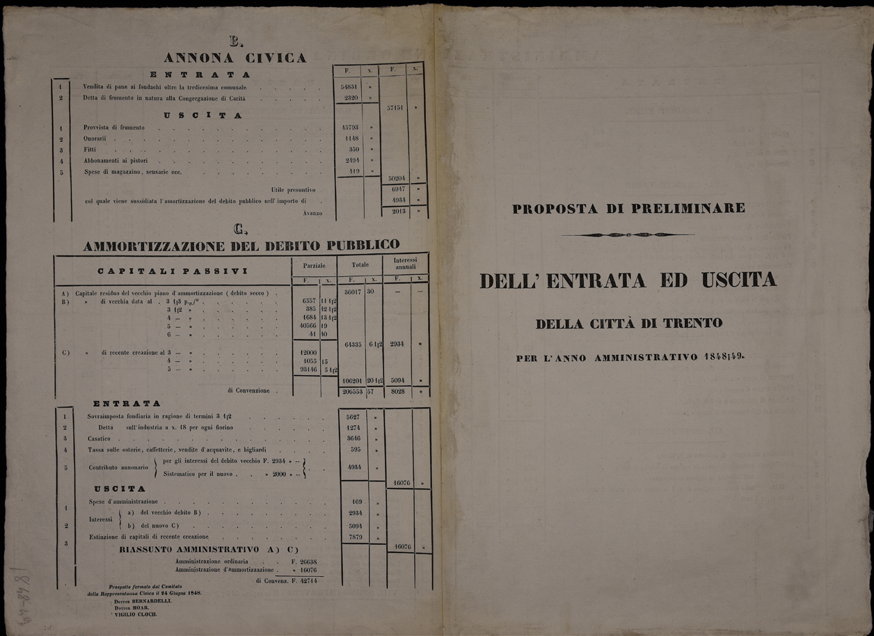 | Proposta di preliminare dell'entrata ed uscita della città di Trento per l'anno amministrativo 1848/49 |