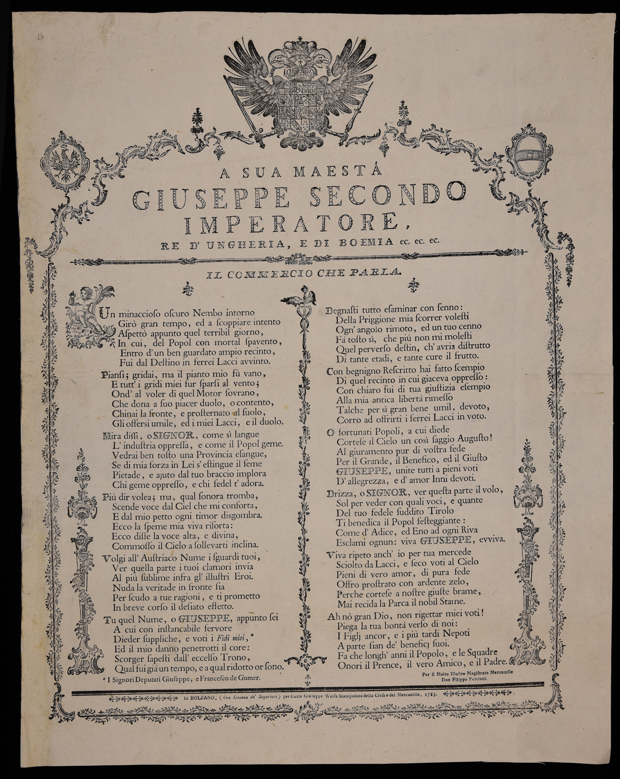 | A sua maestà Giuseppe secondo imperatore, re d'Ungheria, e di Boemia ec. ec. ec. Il commercio che parla |