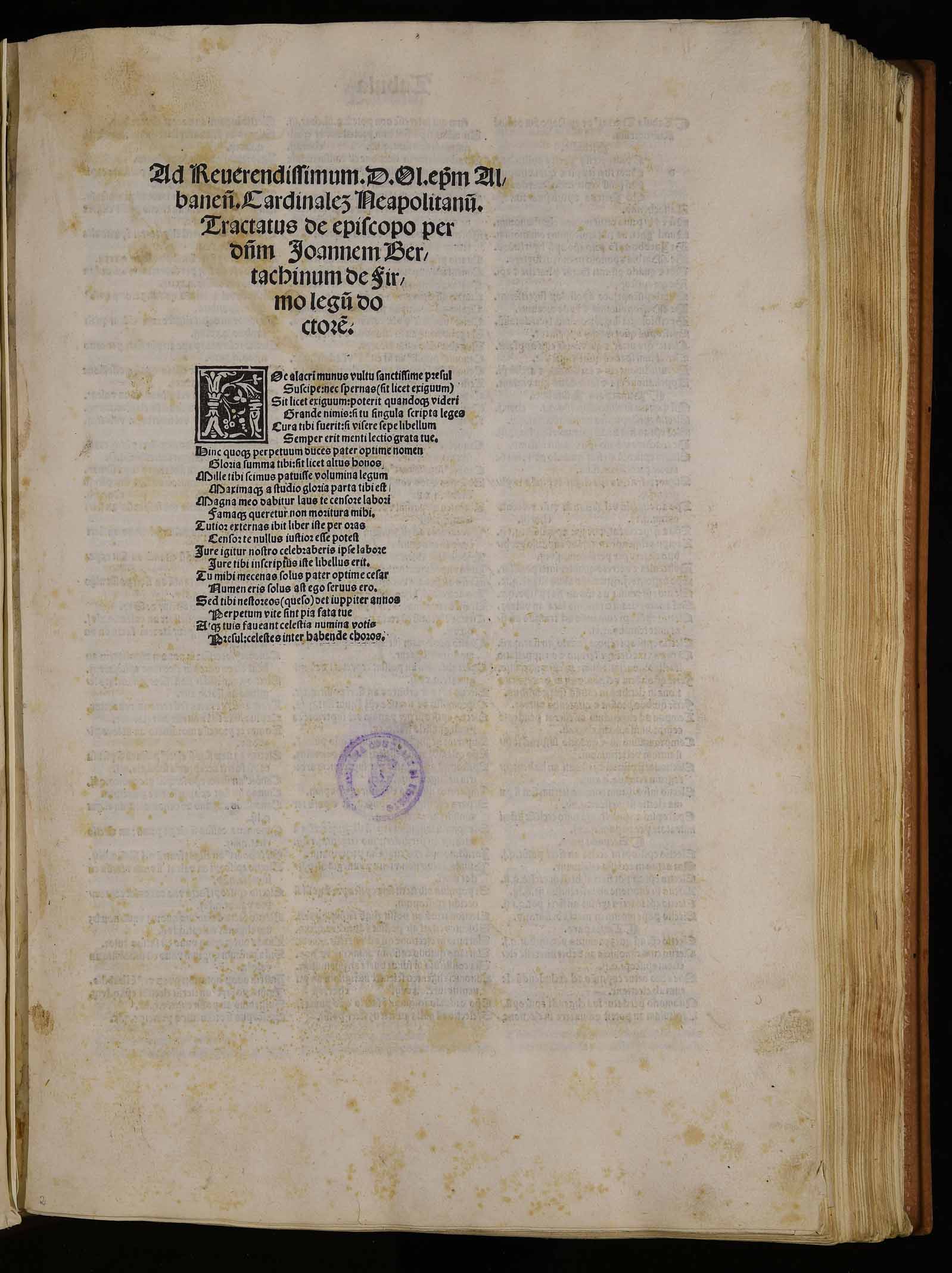 Legatura in piena pelle con impressioni del sec. XVI. Postille. Antica segnatura di collocazione: I 44 a 7. Appartenuto al vescovo di Trento Bernardo Cles e alla Biblioteca vescovile di Trento. Legato in un volume fattizio composto da 6 opere .