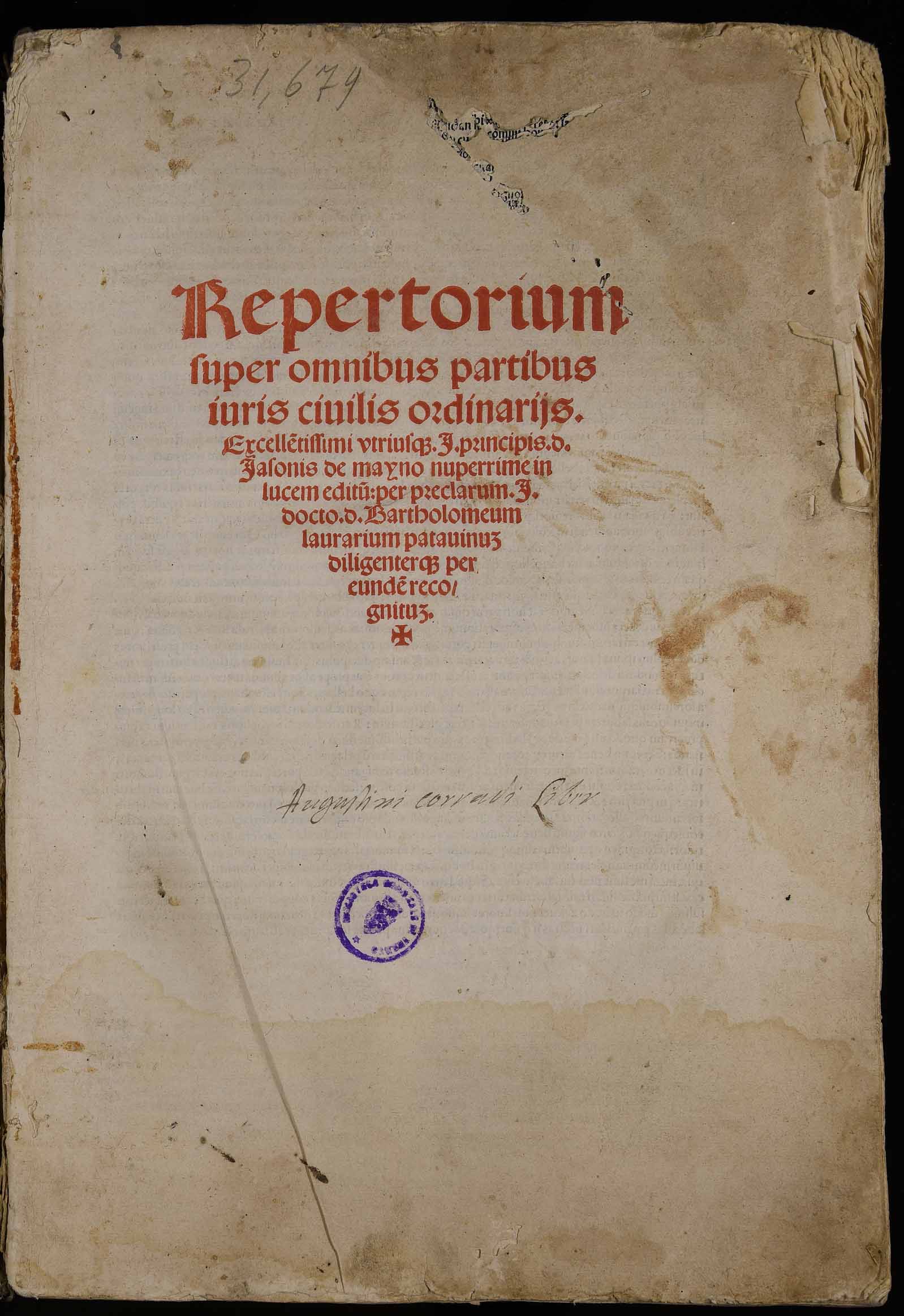| Repertorium super omnibus partibus iuris civilis ordinariis excellentissimi utriusque I. principis d. Iasonis de Mayno nuperrime in lucem editum per preclarum I. docto. d. Bartholomeum Laurarium Patavinum diligenterque per eundem recognitum |