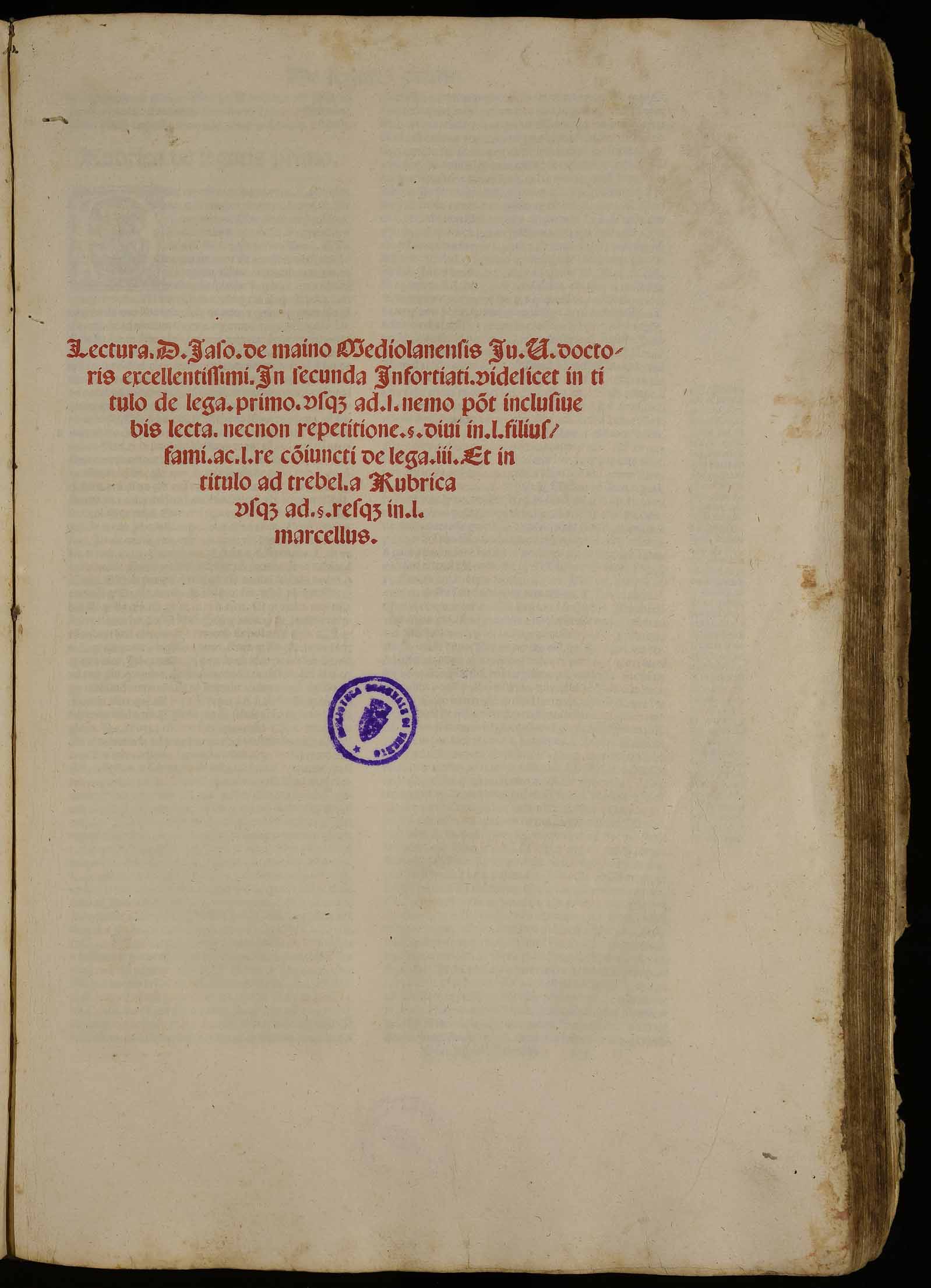 | Lectura d. Iaso. de Maino Mediolanensis Iu. U. doctoris excellentissimi in secunda infortiati videlicet in titulo de lega. primo usque ad l. nemo potuit inclusive bis lecta … |